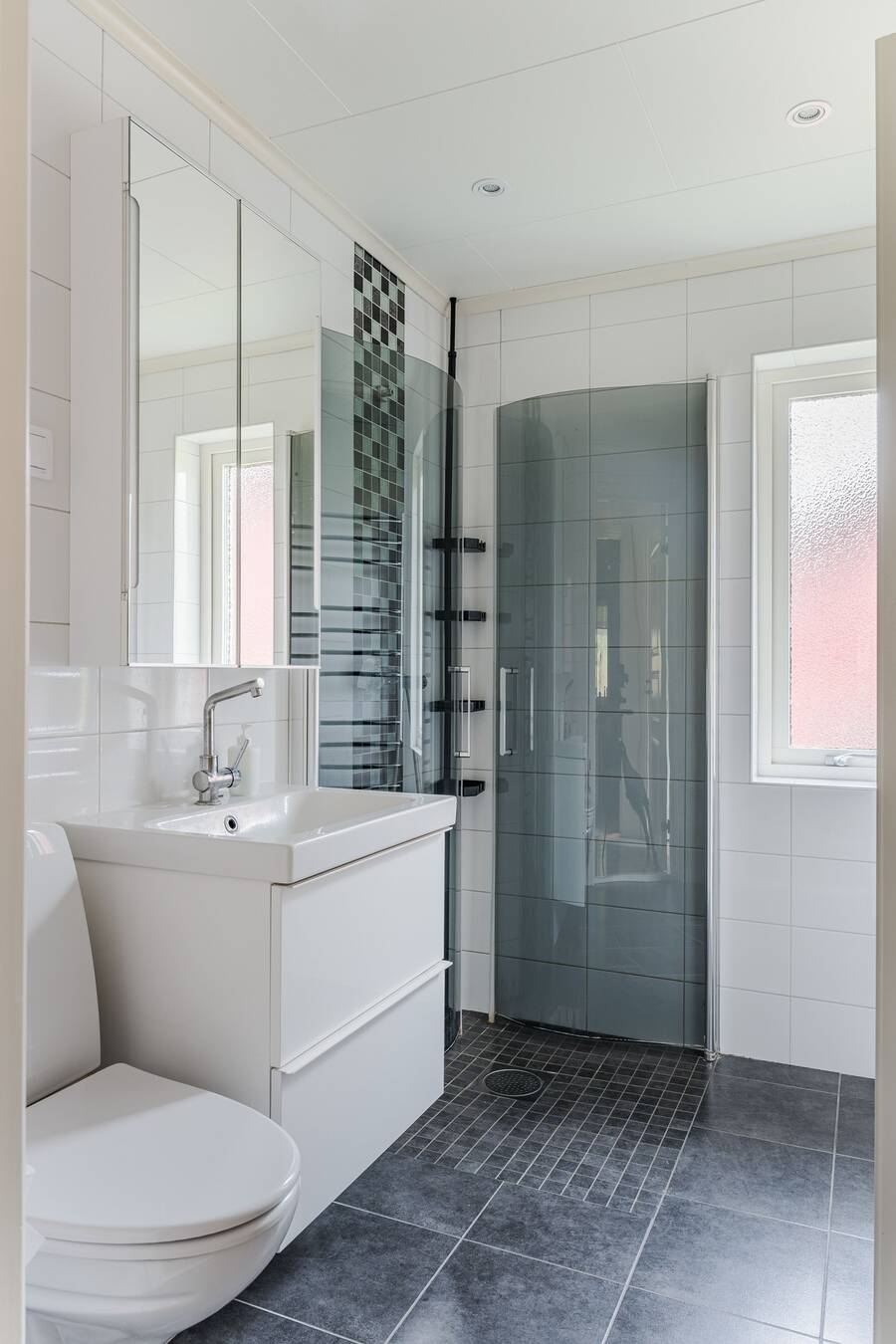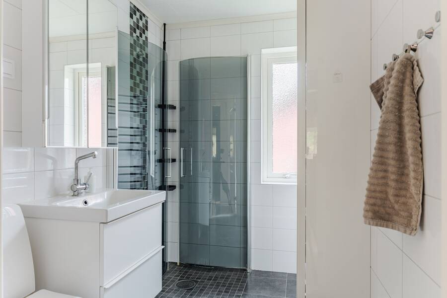 Badrum med kakel/klinker renoverat 2014 (golvvärme). Utrustat med kommod, wc och dusch.