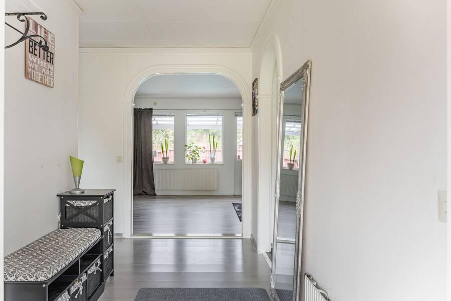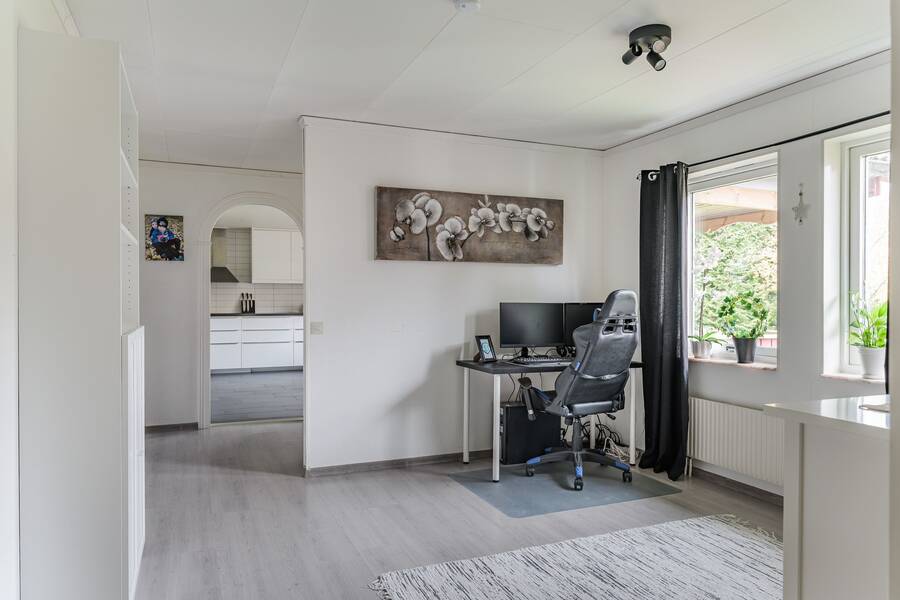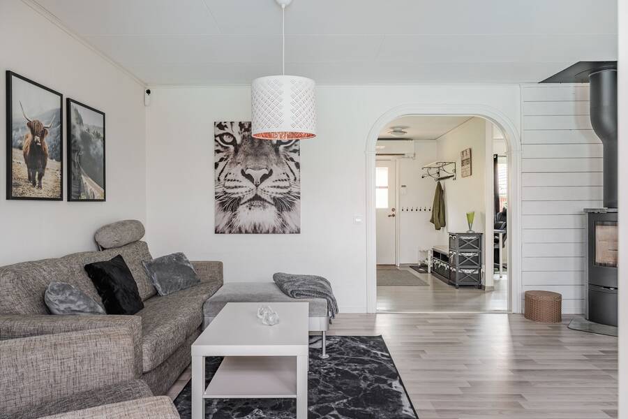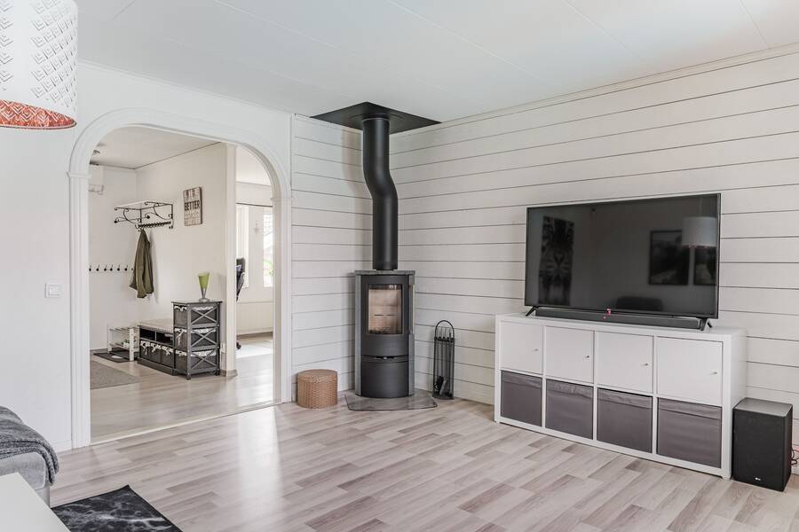 Vardagsrum med braskamin och utgång till altanen. laminatgolv.