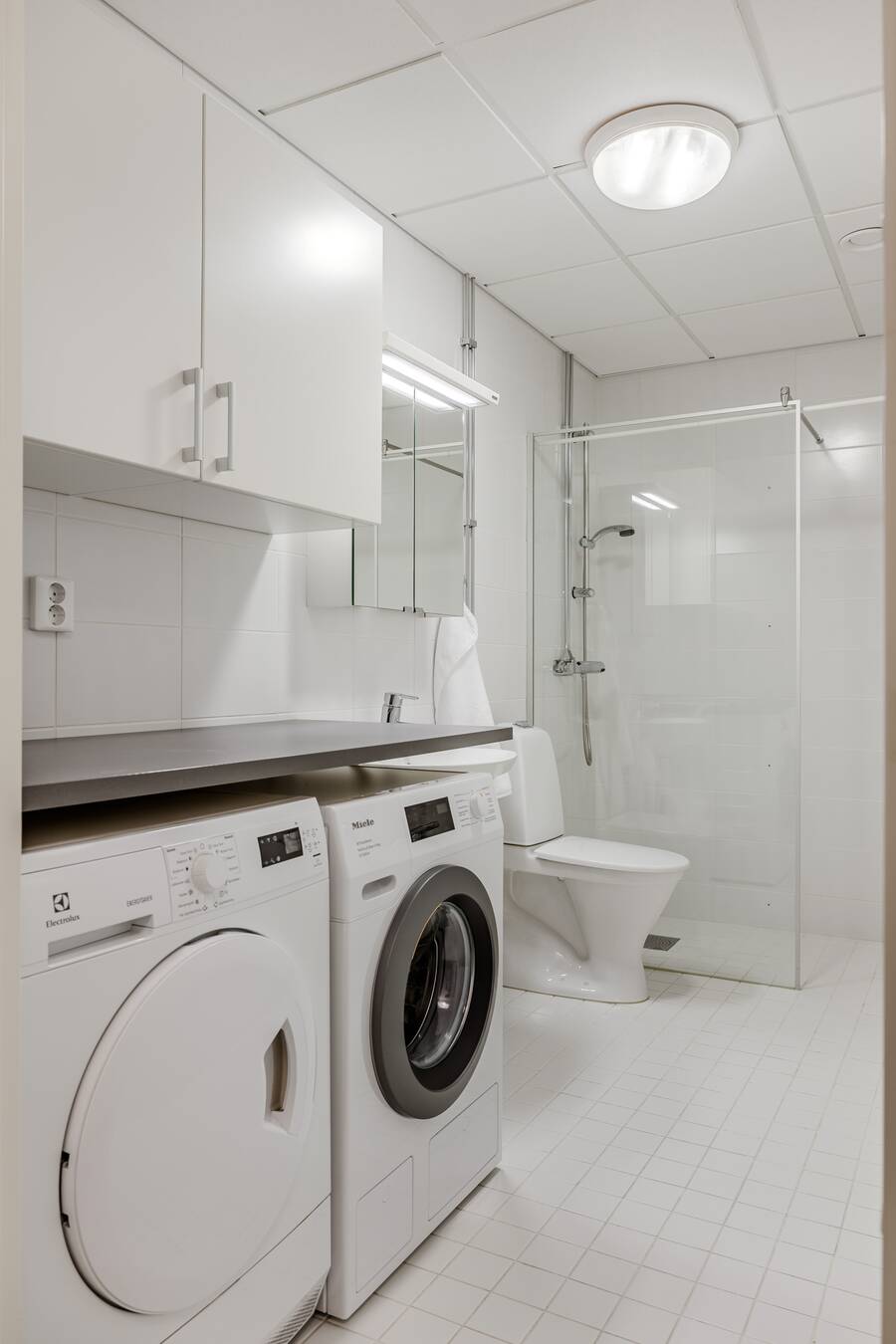 Badrum med kakel/klinker (golvvärme). Utrustat med kommod, wc, dusch, handdukstork, tvättmaskin och torktumlare.