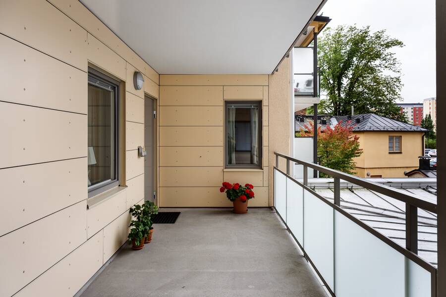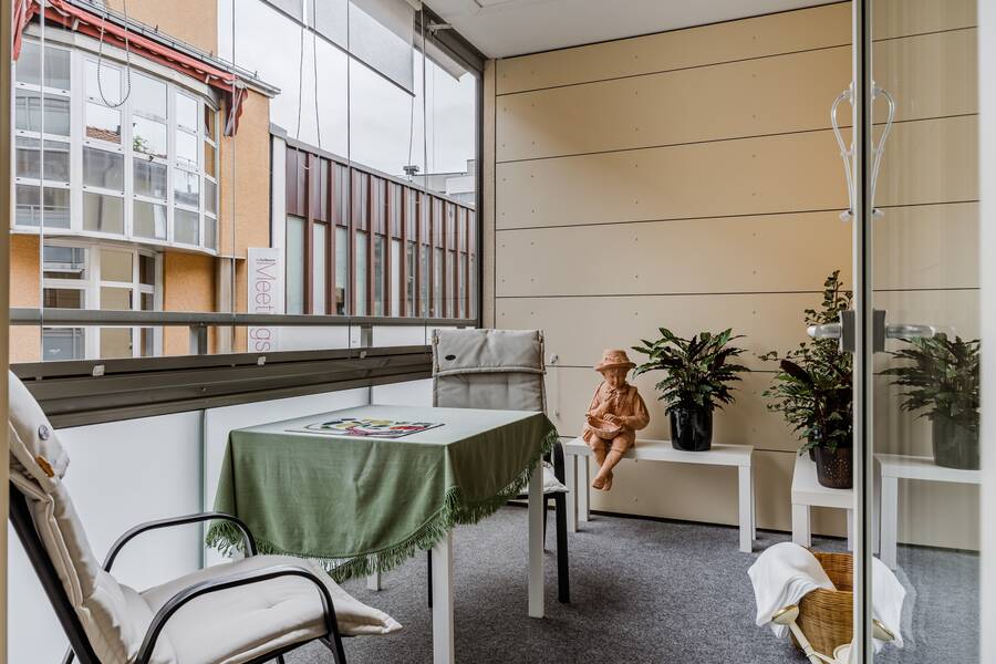 Rymlig inglasad balkong med morgonsol och bostaden har en egen ingång.