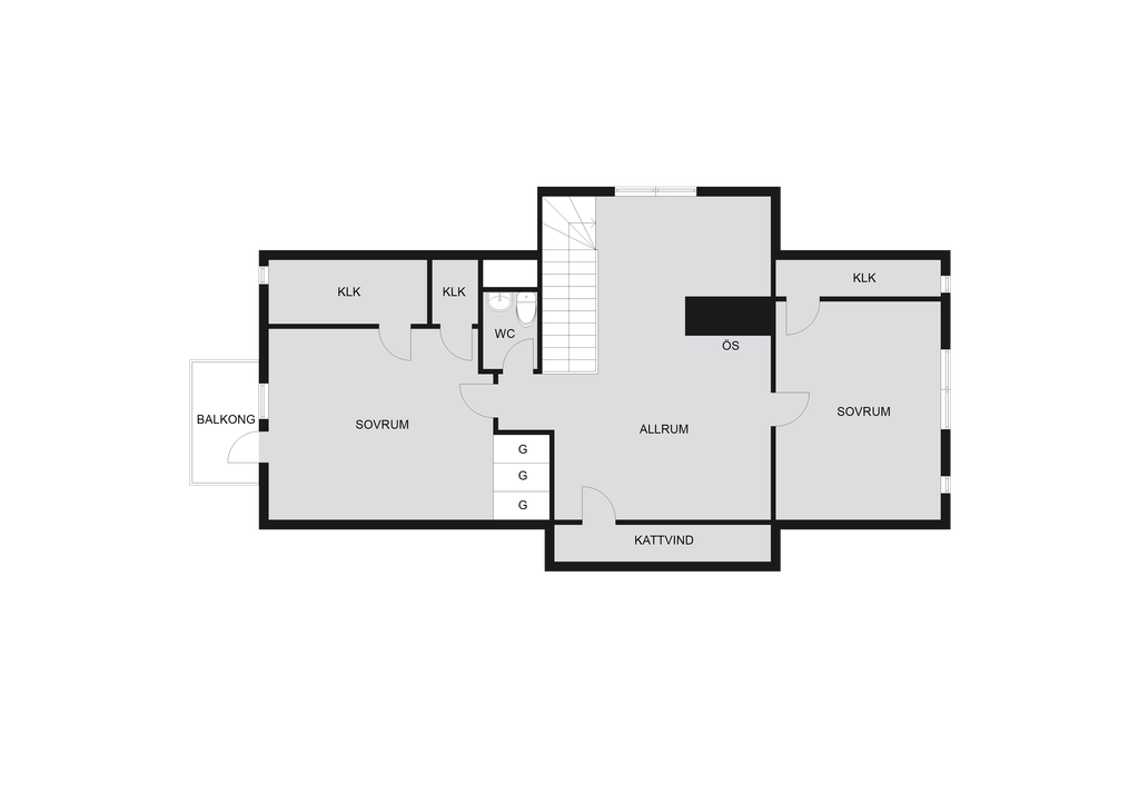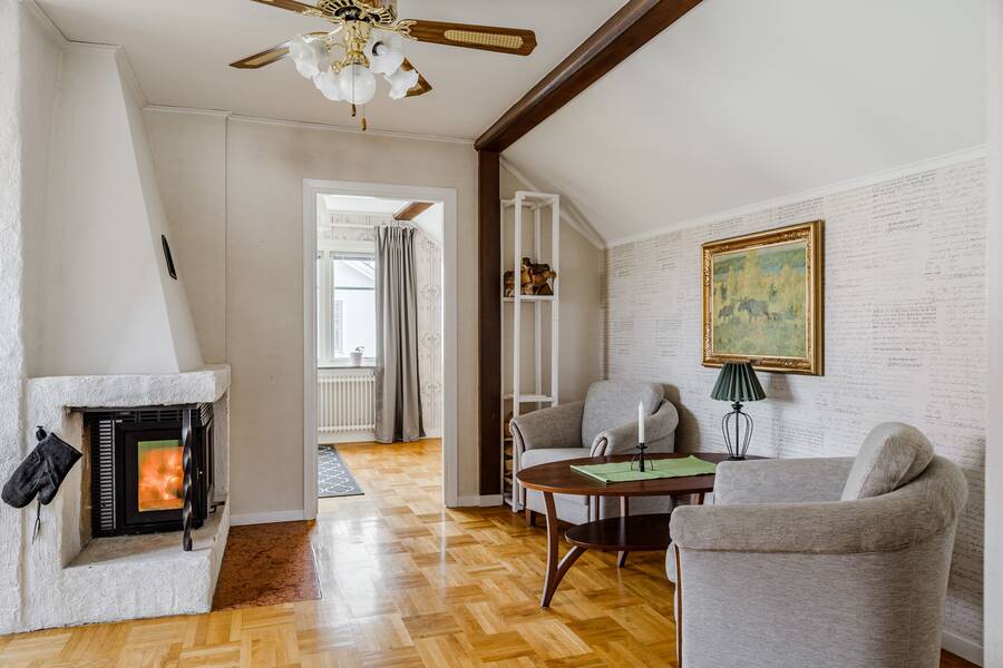 Mysigt allrum med öppen spis som har insats och ytterligare ett wcrum på övre plan.