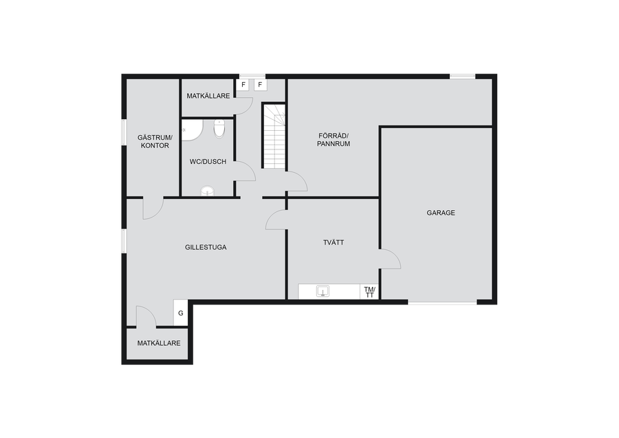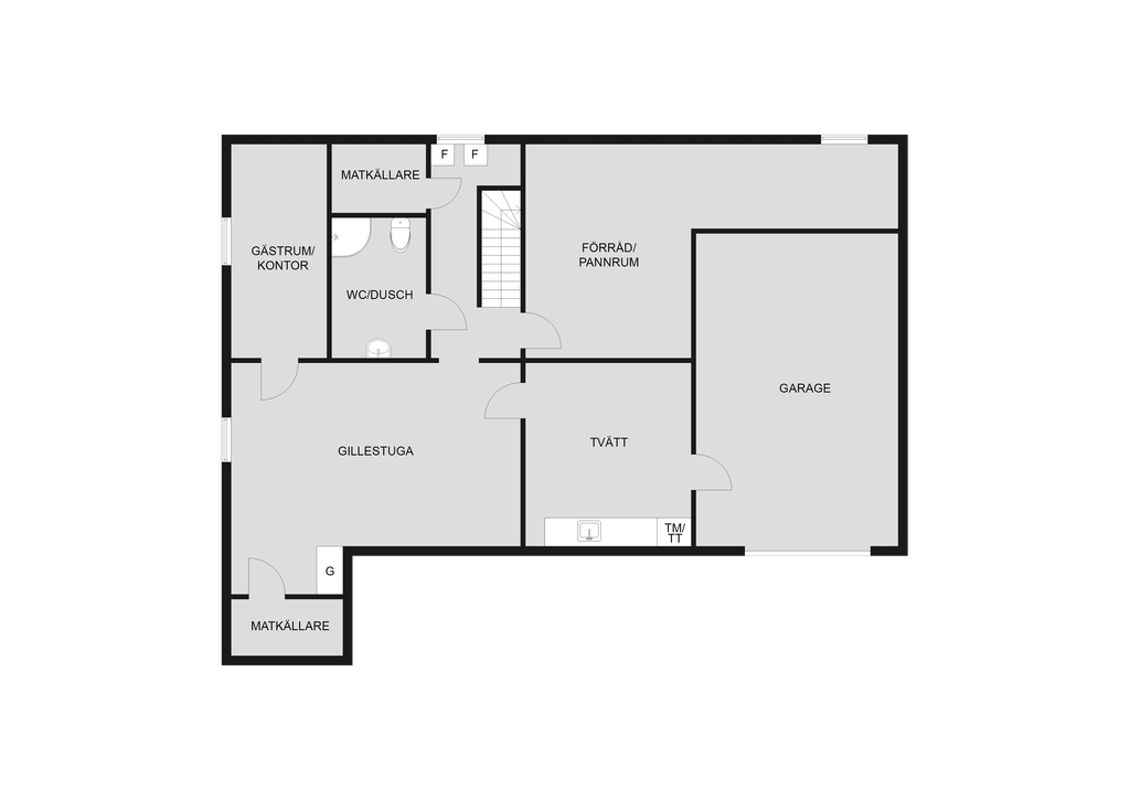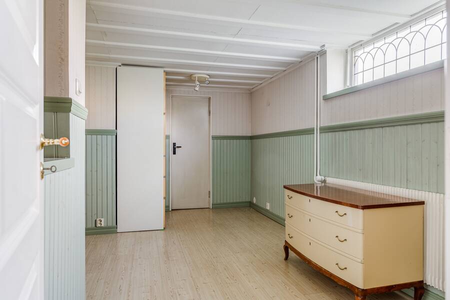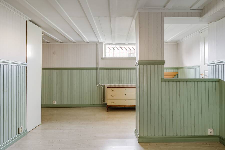 Källaren rymmer gillestuga, gästrum och praktiska ytor för förvaring eller hobby.