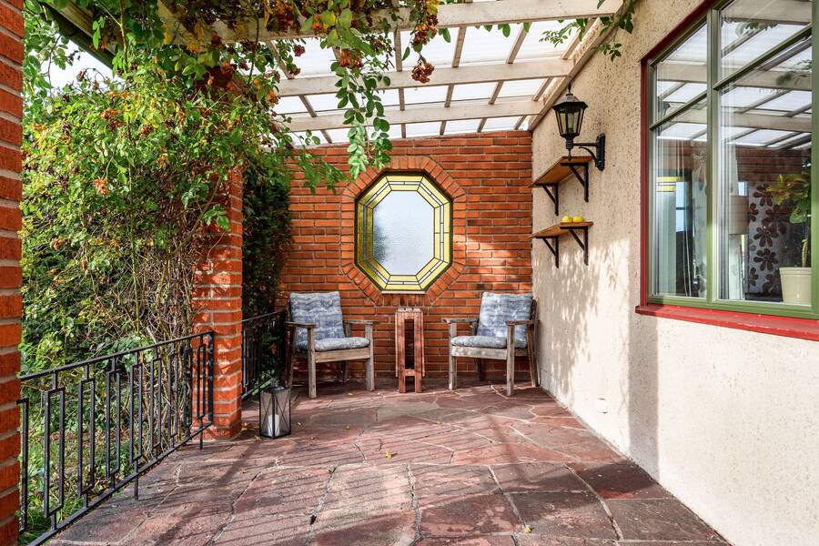 Trivsam solig uteplats och härlig uppväxt trädgård.