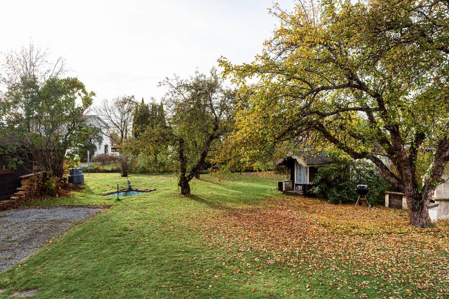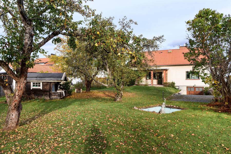 Uppväxt trädgård med äppel-, plommonträd, hallon och bärbuskar. Här finns också en damm.
