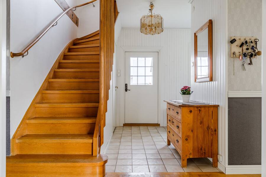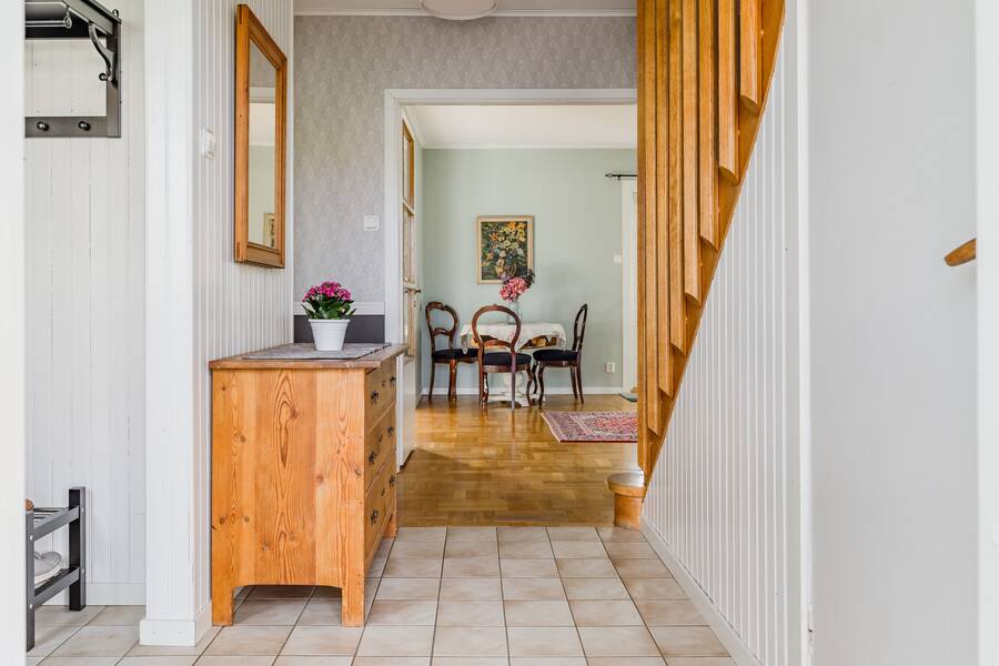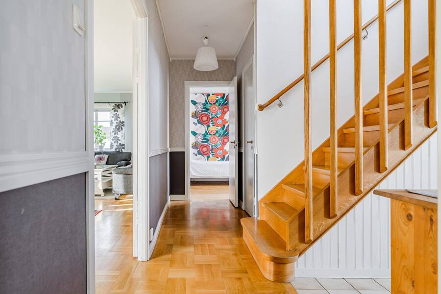 Hall med klinker/parkettgolv och trappa till övre plan och källarplan.