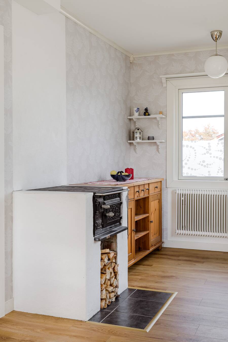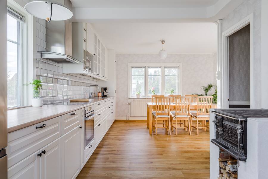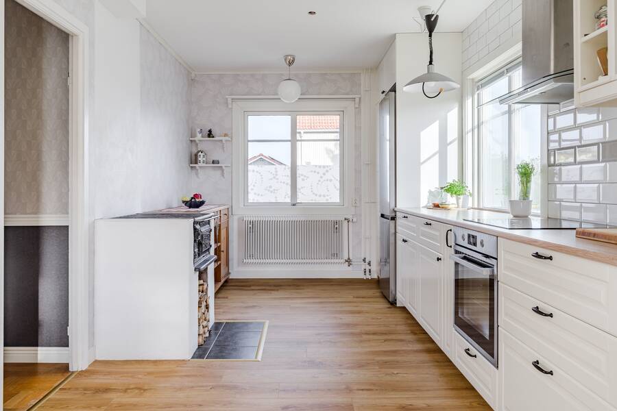 Stort helrenoverat kök från 2023. Utrustat med häll, ugn, fläkt, diskmaskin och kyl/frys (2025). Här finns även en vedspis. Vinylgolv.