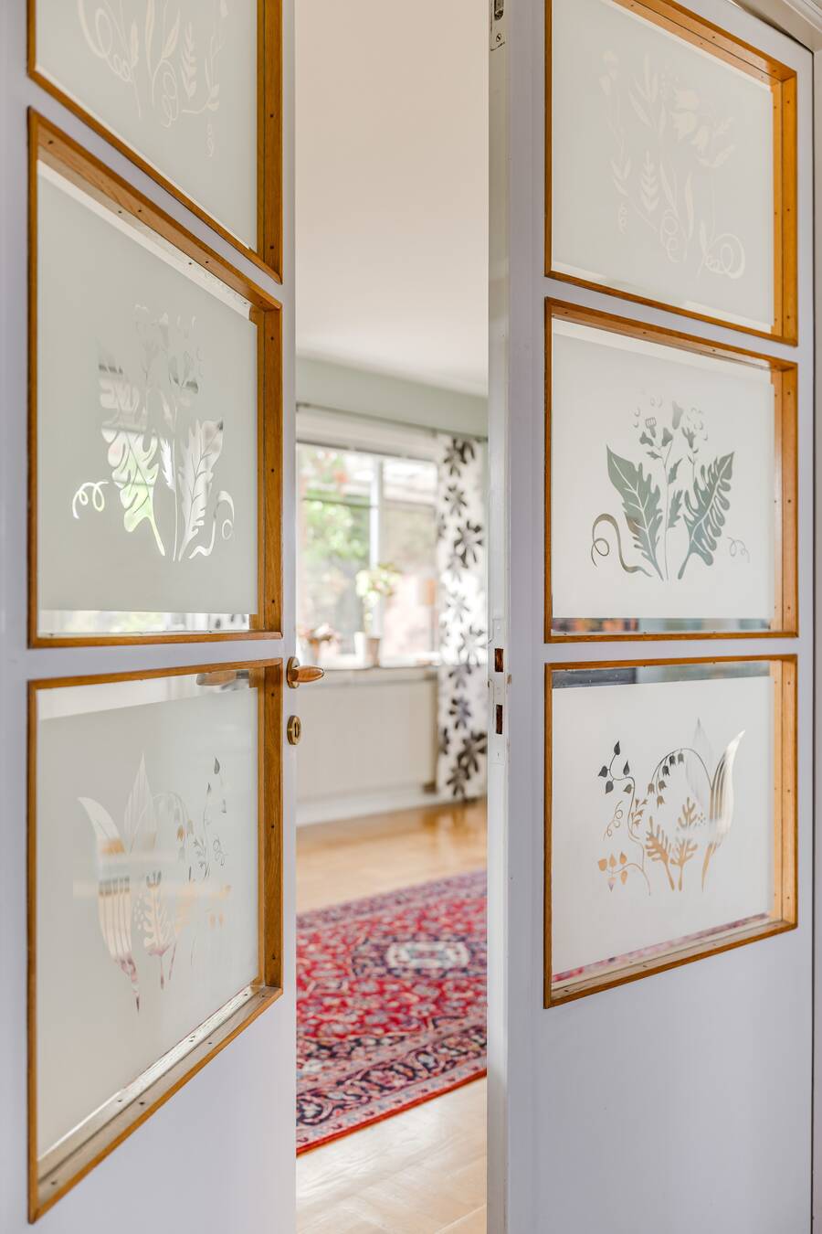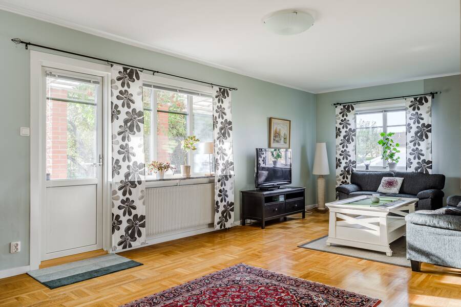 Vardagsrum med parkettgolv och utgång till den takade uteplatsen.