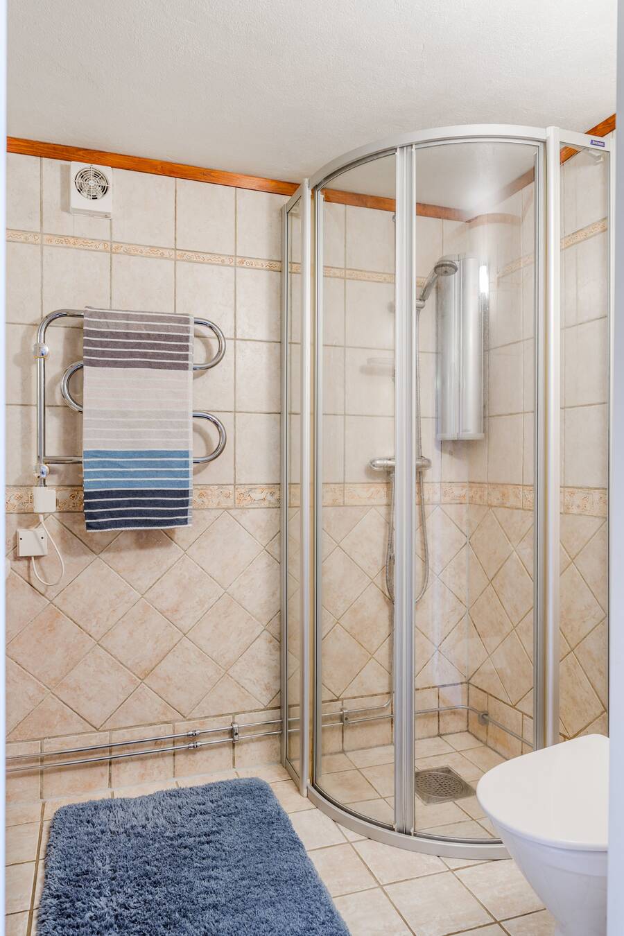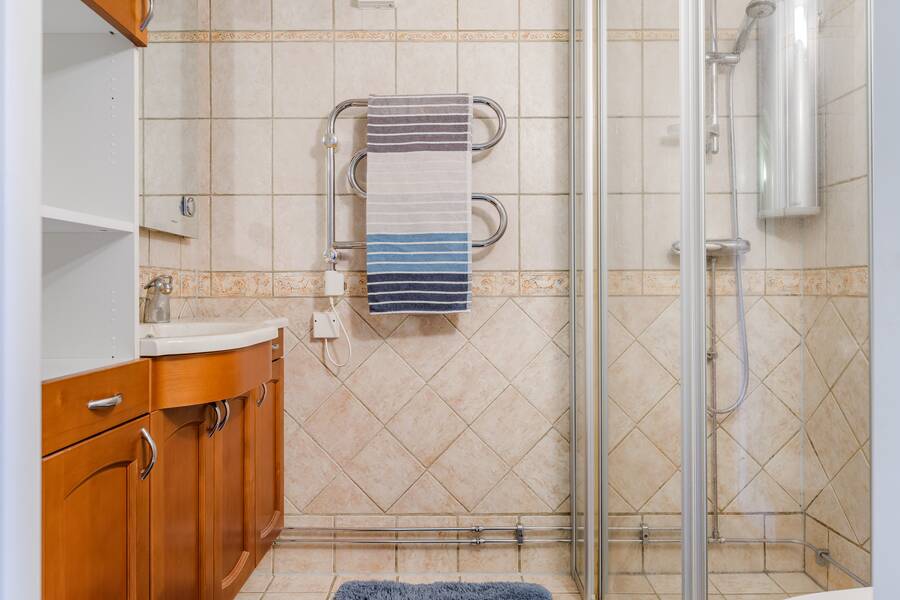 Badrum med kakel/klinker (vattenburen golvvärme). Utrustat med kommod, wc, dusch och handdukstork.