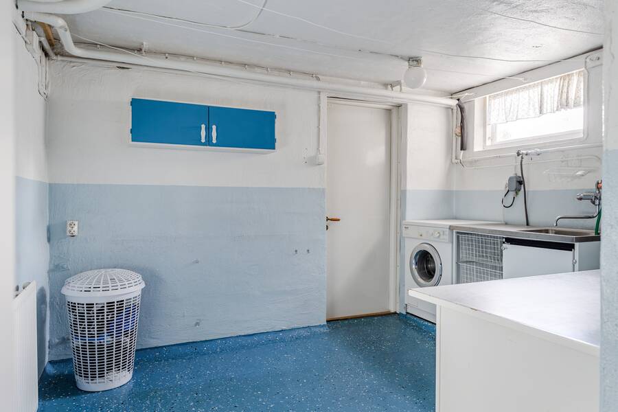 Tvättstuga med tvättho och tvättmaskin.