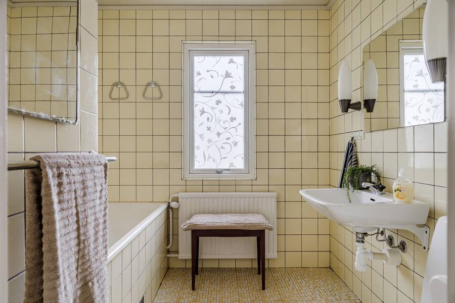 Badrum med kakel/mosaik. Utrustat med tvättställ, wc och badkar.