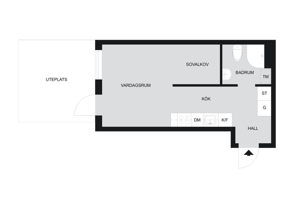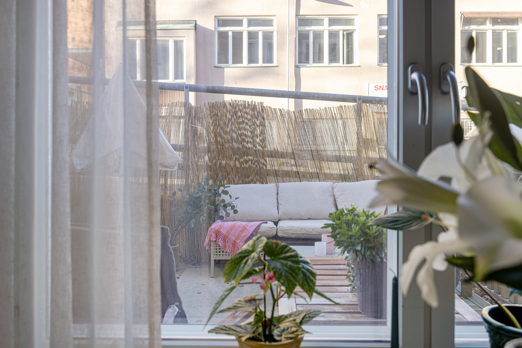 Lägenheten har också en uteplats i anslutning till egen bostadsrätt, perfekt för avkoppling med en kopp kaffe eller umgänge med vänner. Uteplatsen ligger i anslutning till vardagsrummet, vilket skapar en naturlig förlängning av bostadens sociala ytor under de varmare månaderna.