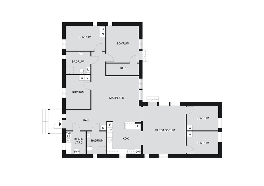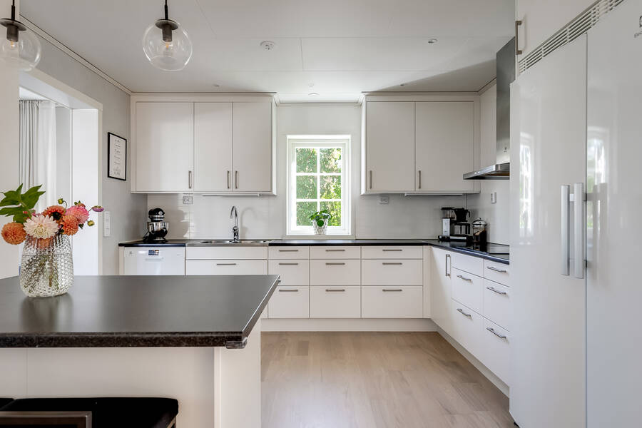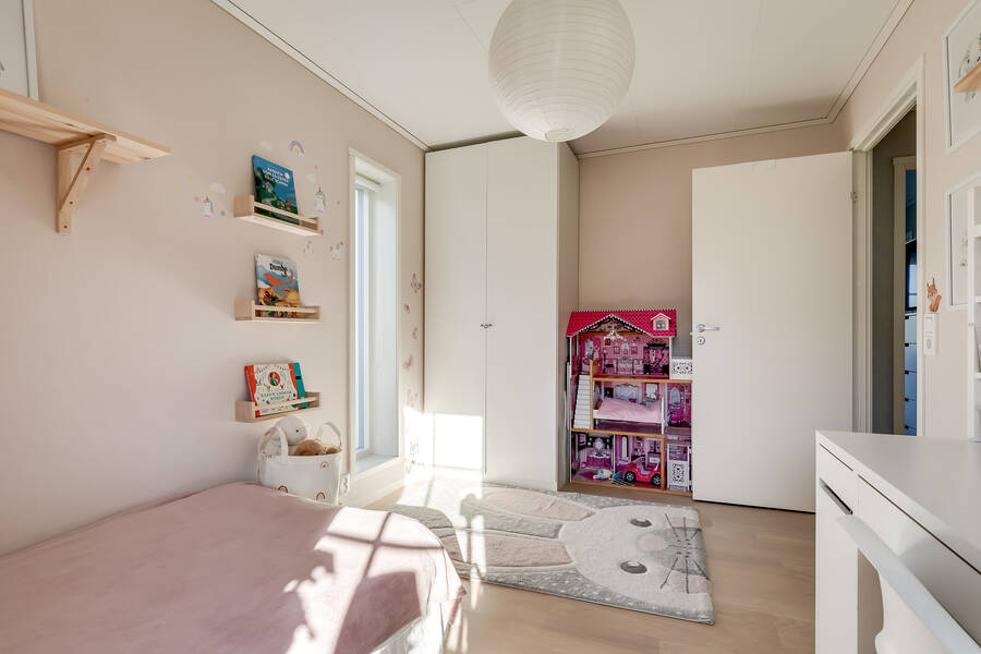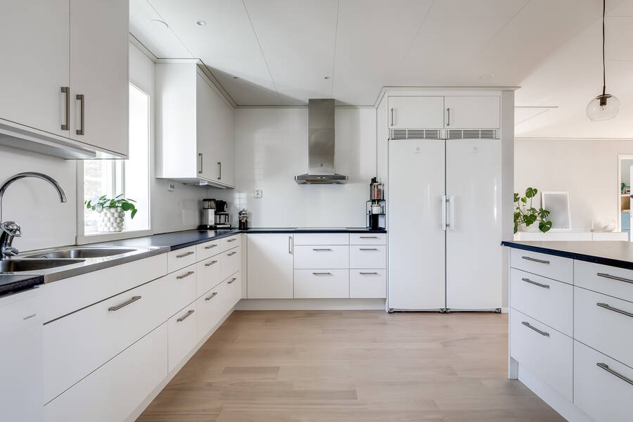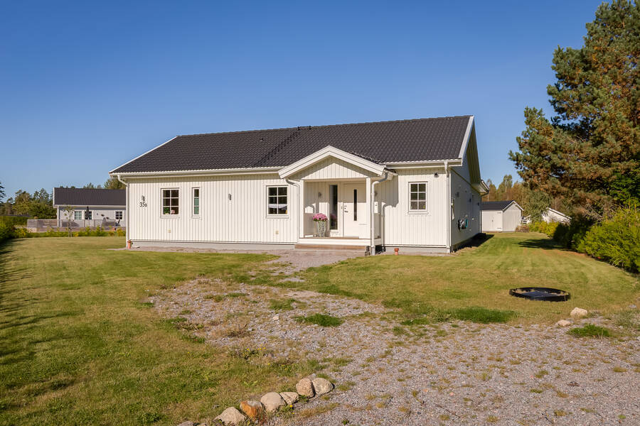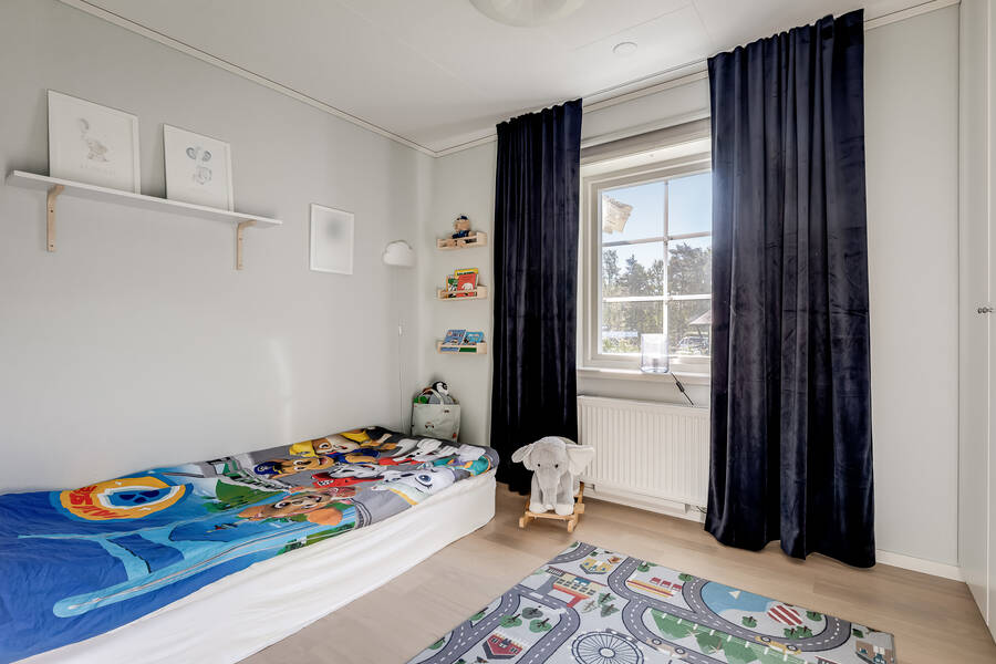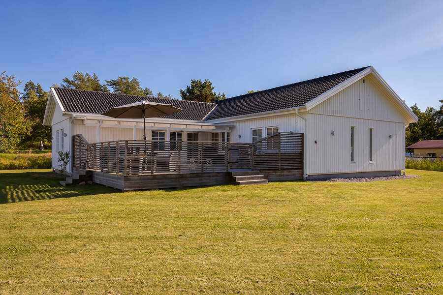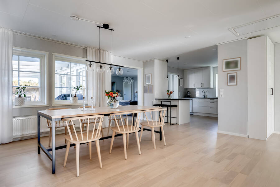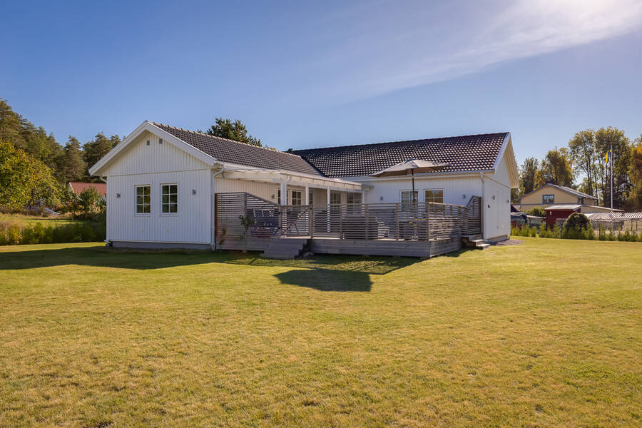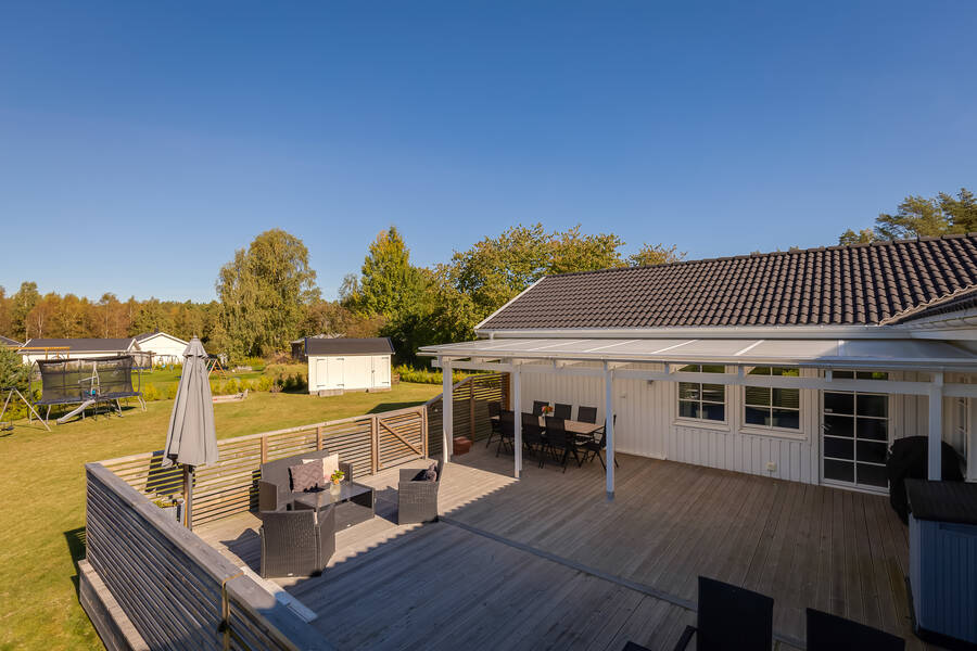 Bostaden är rymlig och välplanerad med fem sovrum, två badrum och öppna sociala ytor som gör vardagen enkel och trivsam. De stora fönsterpartierna skapar ett fint samspel mellan inne och ute, där hemmets hjärta naturligt förlängs ut mot trädäcket.