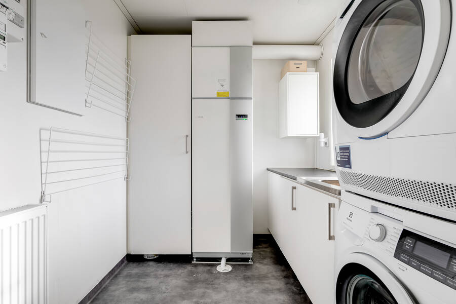 Den separata tvättstugan är funktionell och välplanerad med tvättmaskin, torktumlare och ett vägghängt tvättställ för nytvättade kläder. Här finns också goda förvaringsmöjligheter, arbetsytor och en diskho som gör rummet extra användbart. Ett fönster ger ljusinsläpp.