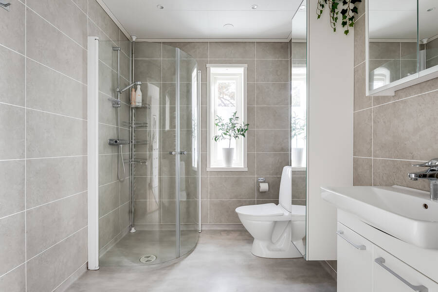 Duschrummet kombinerar praktiska material med en ljus känsla. Plastmatta och våtrumskivor på väggarna möter en duschkabin, wc, handfat med förvaringsutrymme och två vägghängda spegelskåp – ett ovanför kommoden och ett intill. Spotlights i taket ger ett stilrent ljus, och ett mindre dimmat fönster släpper in dagsljus utan insyn. Handdukshängare med värme ger extra komfort.