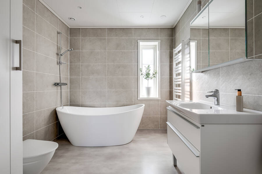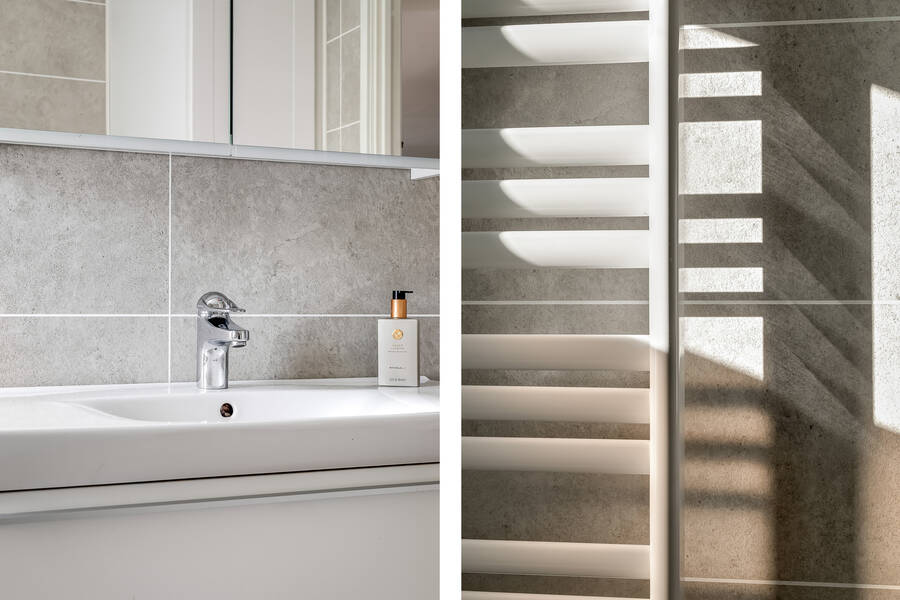 Badrummet följer samma stil som duschrummet med plastmatta och och våtrumskivor på väggarna. Här finns wc, badkar och en generös kommod med större vägghängt spegelskåp ovanför. Förvaringsmöjligheterna är goda med ytterligare ett skåp under handfatet och bredvid. Handdukshängare med värme och spotlights i taket bidrar till komfort och stil.