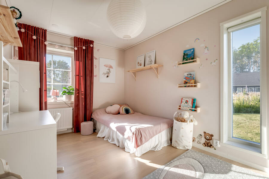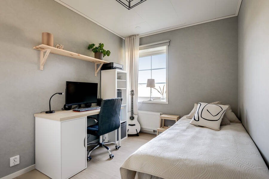 Här möts laminatgolv och tapetserade väggar av två fönster i olika väderstreck – ett vanligt och ett stående avlångt – som skapar karaktär och ljus. Förvaringen är löst med en dubbelgarderob.