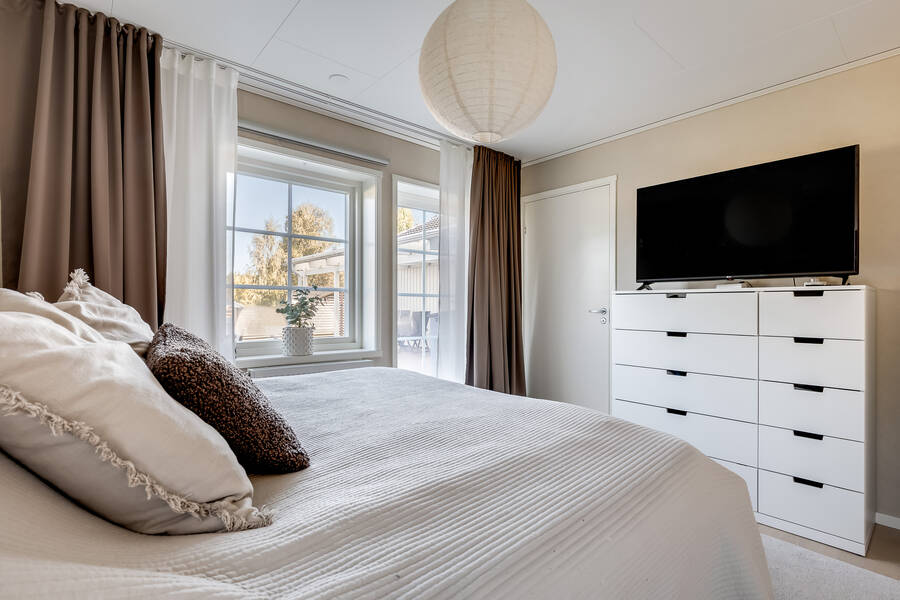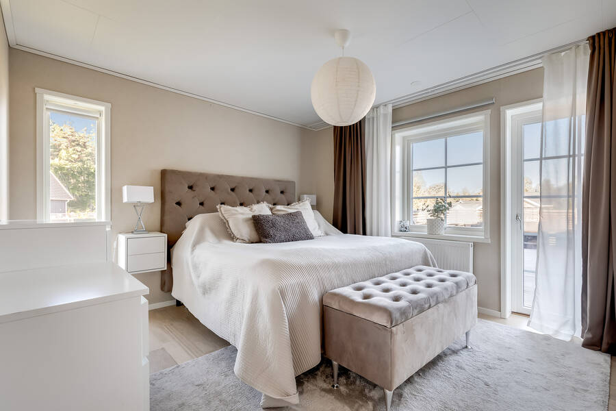 Master bedroom erbjuder generöst ljus från två fönster i olika väderstreck, varav ett stående avlångt. Här finns även en glasdörr mot uteplatsen och direktaccess till en egen klädkammare. Laminatgolv och tapetserade väggar fulländar rummet.