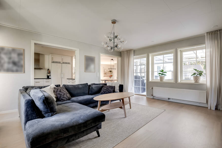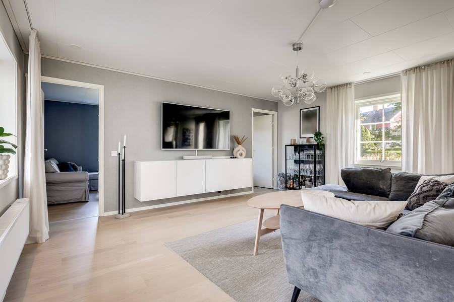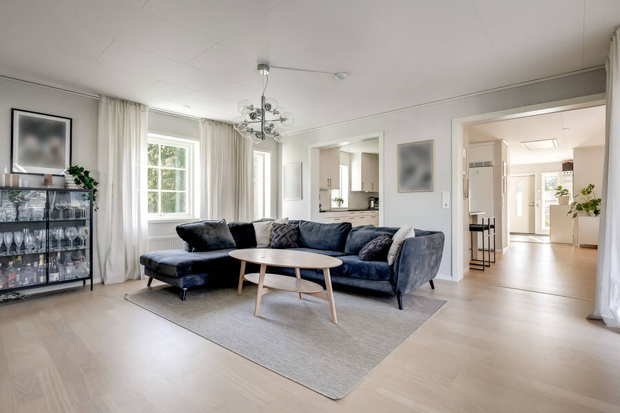 Vardagsrummet är öppet och luftigt med laminatgolv och generöst ljusinsläpp från två väderstreck. Här finns en glasdörr mot uteplatsen med två fönster intill, samt ytterligare ett fönster och ett stående smalt fönster på motsatt sida. De tapetserade väggarna ramar in en trivsam samlingspunkt, och rummet leder vidare till två av husets sovrum.