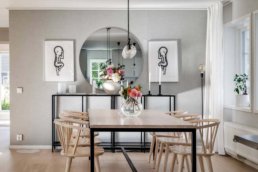 Matplatsen ligger i öppen planlösning mot köket och har ett ljusare laminatgolv som ger en varm bas. Här finns två fönster med utsikt mot uteplatsen samt ett tredje fönster från kökets håll. Tapetserade väggar ramar in ytan och skapar en naturlig plats för familjens samlingar.