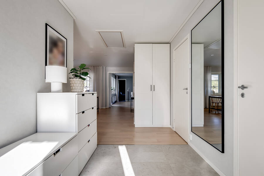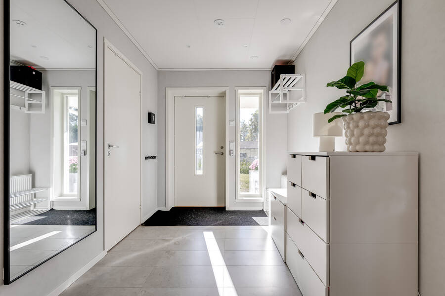 Hallen välkomnar med ljusa stenplattor på golvet och tapetserade väggar som ramas in av spotlights i taket. Smala fönster i och vid dörren släpper in dagsljus och skapar en trivsam entré. Härifrån når man tvättstugan och resten av huset, och i passagen mot matplatsen finns en praktisk dubbelgarderob som ger gott om förvaring.