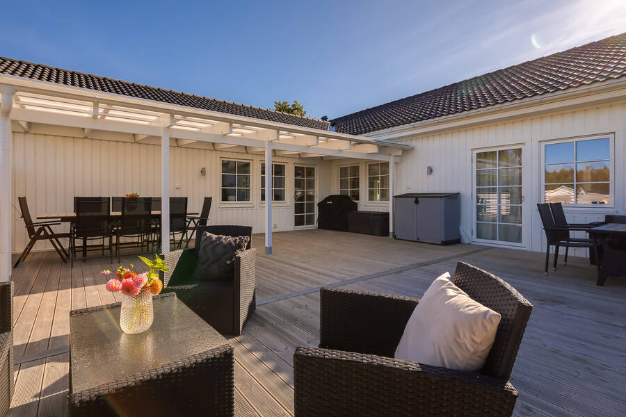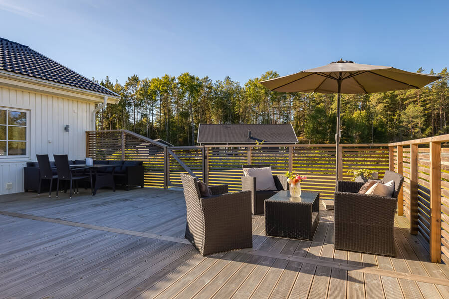 Uteplatsen består av ett generöst trädäck med gott om plats för flera loungegrupper, solstolar och planteringar. Här ryms även en större matplats där man kan samlas och njuta av måltider och umgänge under sommarhalvåret.