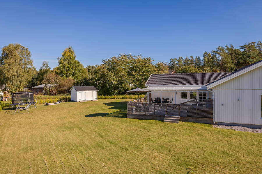 Utemiljön är något alldeles extra. Här finns en generös altan med plats för både lounge, grillhörna och en större matplats – den självklara samlingspunkten under årets varmare dagar. Tomten om hela 1 664 kvm erbjuder dessutom en stor, plan gräsmatta som bjuder in till lek, spel, odling eller bara skön avkoppling i solen. Möjligheterna är många, oavsett om du vill skapa en barnvänlig oas eller en stilfull trädgårdsmiljö.