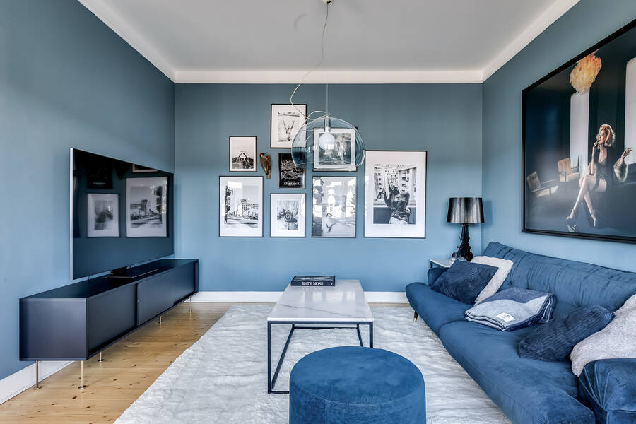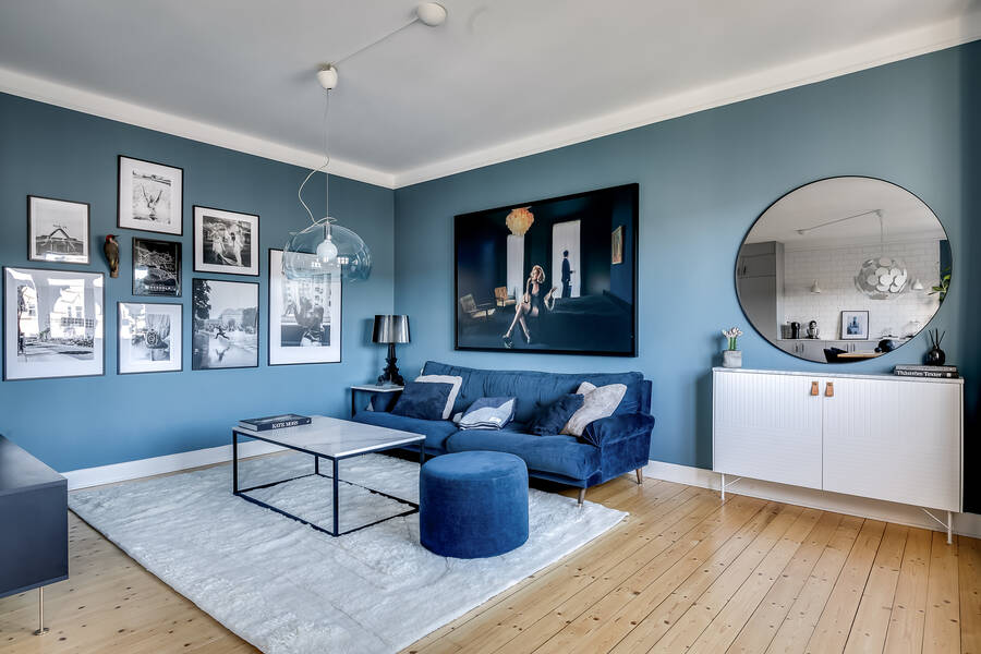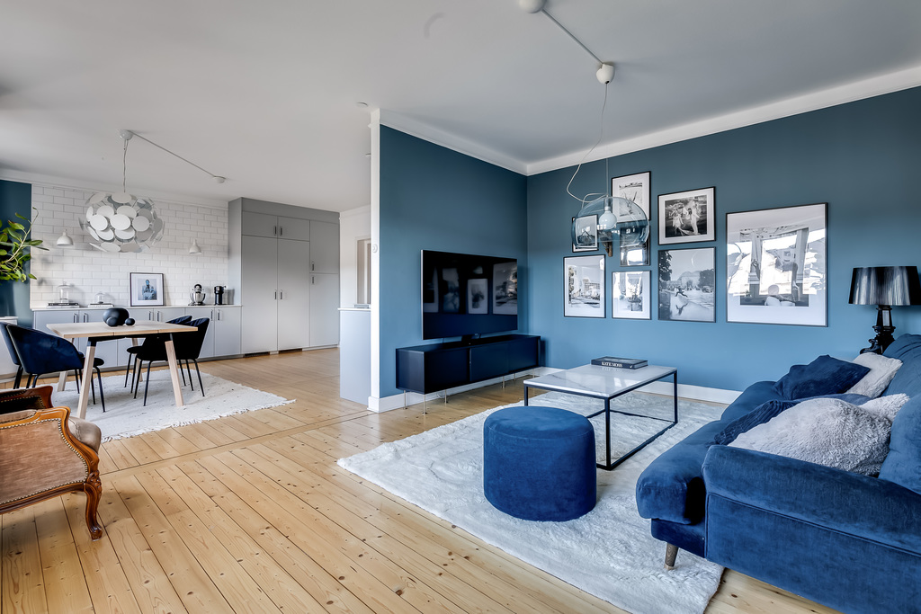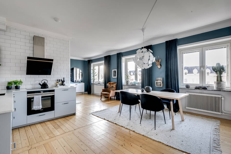 Vardagsrummet, som är i direkt anslutning till köket, erbjuder plats för stor soffgrupp och annat möblemang efter behov. Det är ett ljust och luftigt rum med flera fönster som ger ett fantastiskt ljusinsläpp. Det generösa rummet, tillsammans med de ursprungliga trägolven och målade väggar i blå ton, skapar en harmonisk och inbjudande miljö för både vardag och fest.