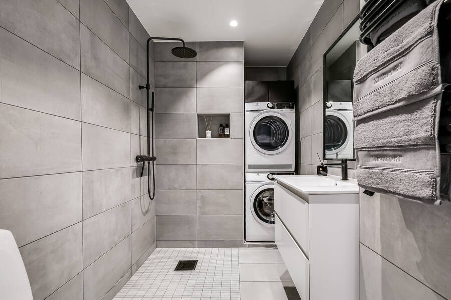 Badrummet är elegant och praktiskt med stora, moderna grå kakelplattor, takdusch, och en smart placerad tvättmaskin och torktumlare. Här får du en lyxig känsla av hotellstandard, samtidigt som allt du behöver i vardagen finns på plats.