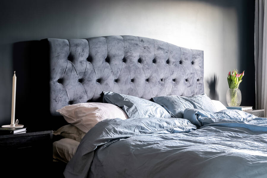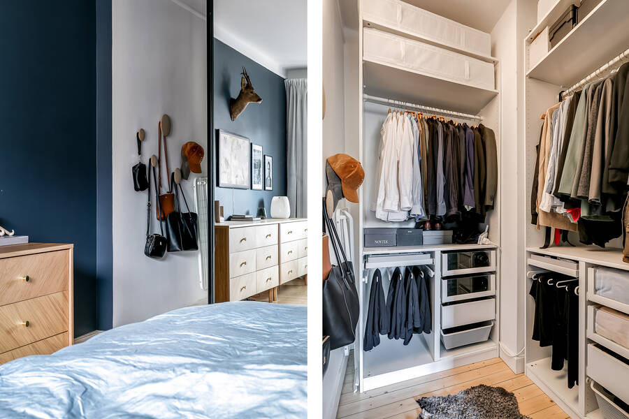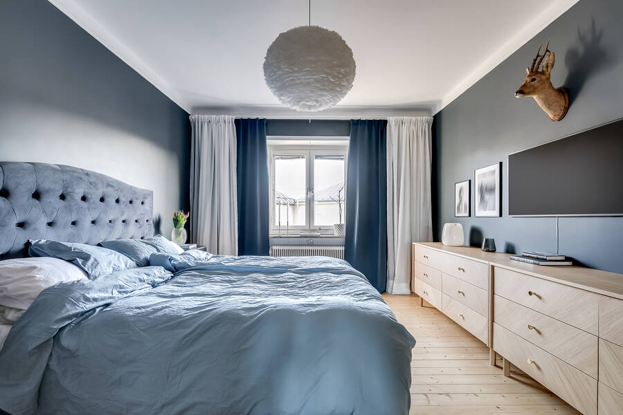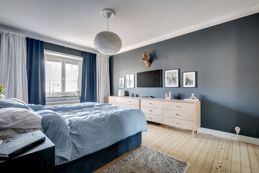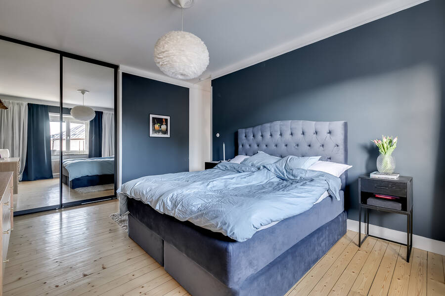 Master bedroom är rymligt och erbjuder plats för dubbelsäng, sängbord och annan inredning efter behov. Här finns en generös walk-in closet som ger gott om förvaring. Med originalgolv i trä, blåmålade väggar och fönster mot den lugna och grönskande innergården blir detta en rofylld plats att återvända till.