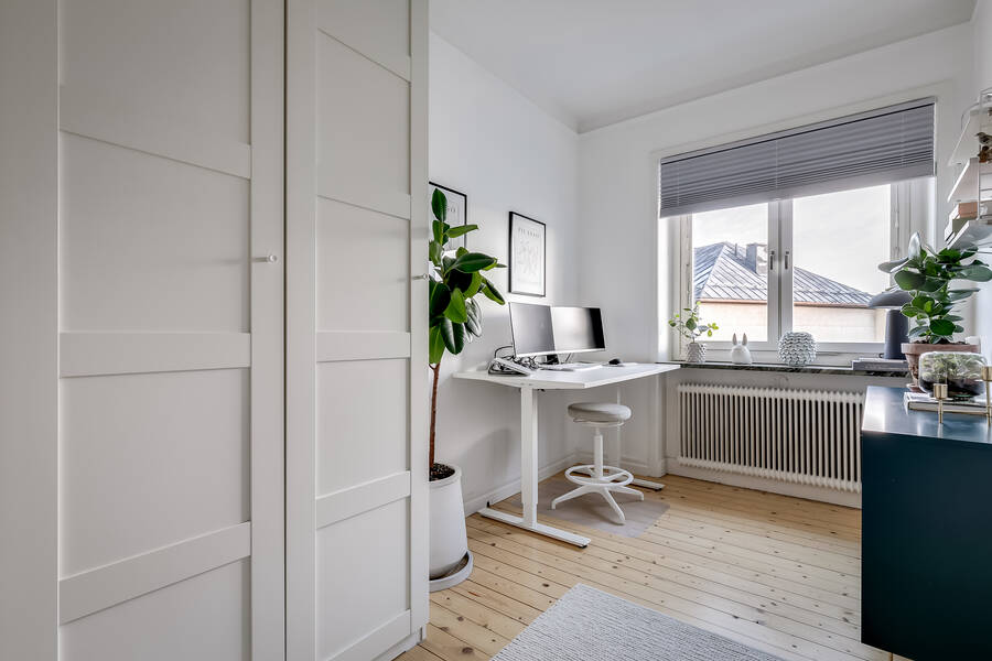 Det andra sovrummet är välplanerat och har gott om plats för både säng, skrivbord och övrig förvaring. Väggarna är vitmålade, vilket förstärker rymden och ljuset i rummet. Ett perfekt rum för barn, gäster eller hemmakontor.