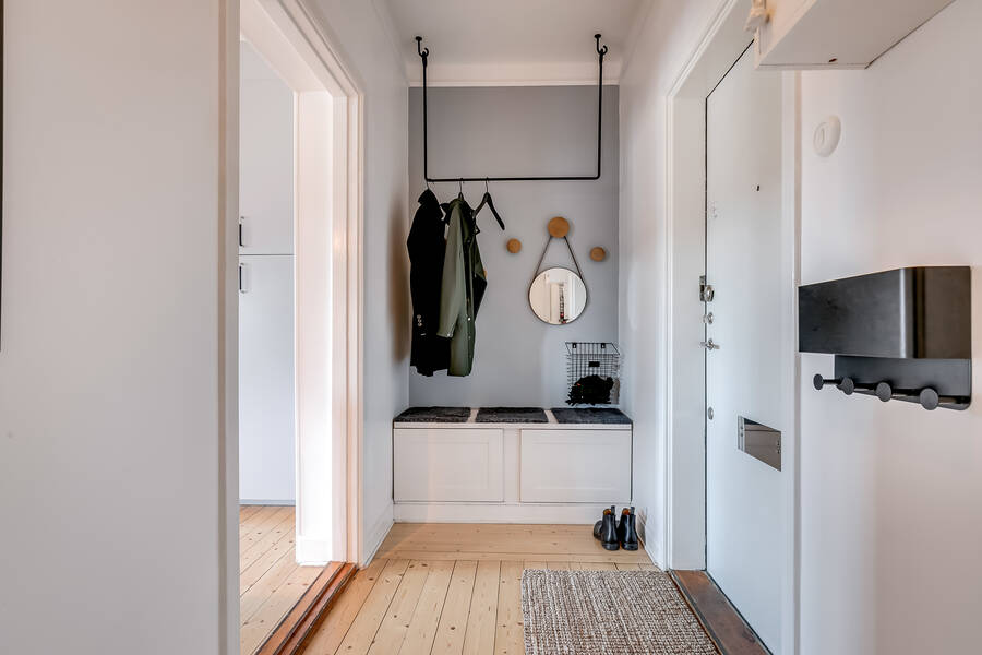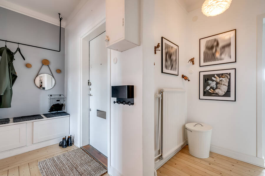 Välkommen in i denna ljusa och hemtrevliga bostad där en rymlig och öppen entréhall omedelbart skapar en inbjudande känsla. Här finns gott om plats för avhängning av ytterkläder och skor. Ljuset flödar in från bostadens stora fönster och sätter tonen direkt. Trägolv i original och målade vita väggar bidrar till den tidlösa charmen.