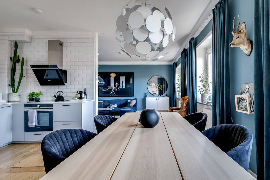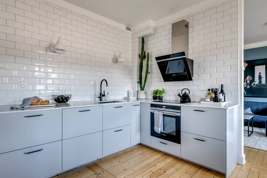 Ett stort och genomtänkt kök från 2019 som verkligen måste upplevas på plats! Köket är inrett i en modern blå kulör med vitspräcklig stenskiva som arbetsbänk och helkaklade väggar i vitt som ger en stilren känsla. Här finns gott om arbetsytor och förvaring genom flertalet underskåp och överskåp. Med sin öppna planlösning mot matplatsen och de stora sociala ytorna är detta kök perfekt för både matlagning och umgänge. De stora fönstren i sydvästläge släpper in rikligt med naturligt ljus och skapar en varm och inbjudande atmosfär. Maskinell utrustning består av integrerad kyl och frys, integrerad diskmaskin, inbyggd ångugn, induktionshäll samt stilren fläktkåpa i rostfritt stål.