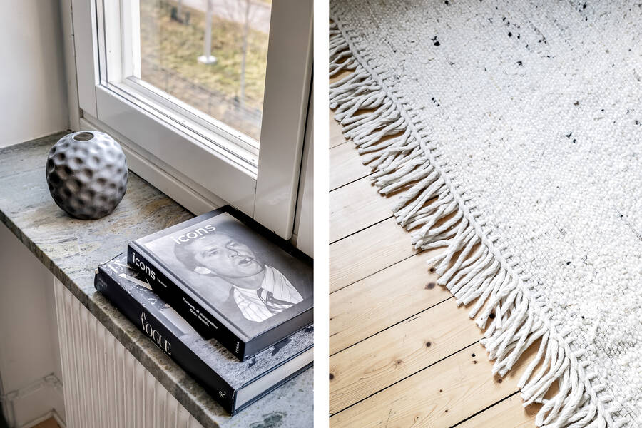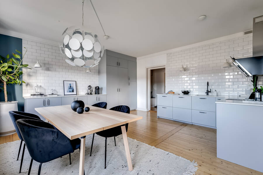 De sociala ytorna är rymliga och perfekt anpassade för umgänge. Här finns plats för både större middagar och mysiga stunder i soffan. Stilrena detaljer och välvalda materialval präglar hela bostaden.