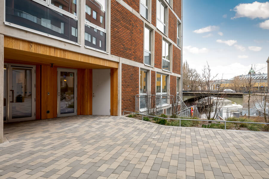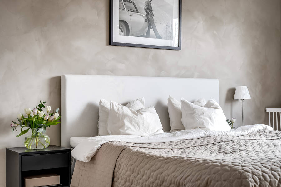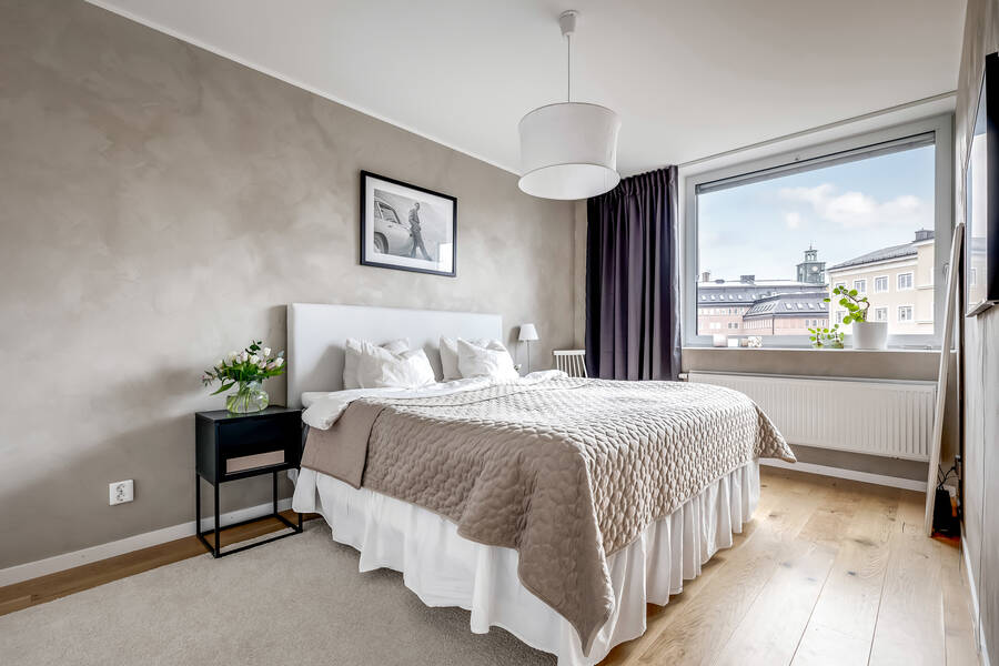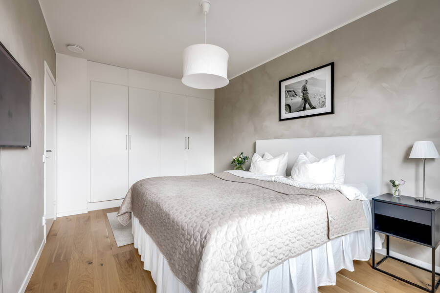 Det stora sovrummet har väggar i en vacker kalkstensfärg som skapar ett unikt och inbjudande intryck. Dessutom finns ett extra stort förråd i bostaden, vilket ger flexibilitet att inreda det som sovrum, gästrum, kontor eller walk-in closet. Utöver detta erbjuds ett andra sovrum med fönster mot strömmen perfekt som kontor eller gästrum samt en rymlig klädkammare i anslutning till hallen för optimal förvaring.