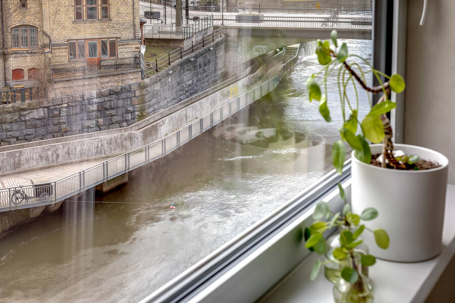 Ljust och luftigt vardagsrum där stora fönster släpper in rikligt med dagsljus och ger en fantastisk utsikt över strömmen. På våning 2 upplevs närheten till vattnet på ett sätt som inte är möjligt högre upp i huset. Rummet har en öppen och social planlösning som skapar en naturlig samhörighet med köket. Här finns gott om plats för både soffgrupp och matplats, perfekt för umgänge.