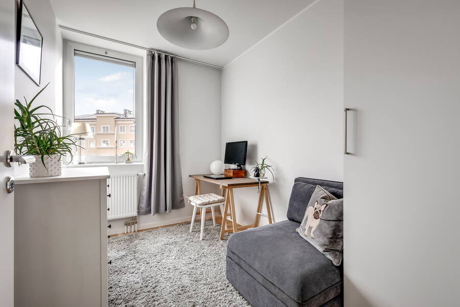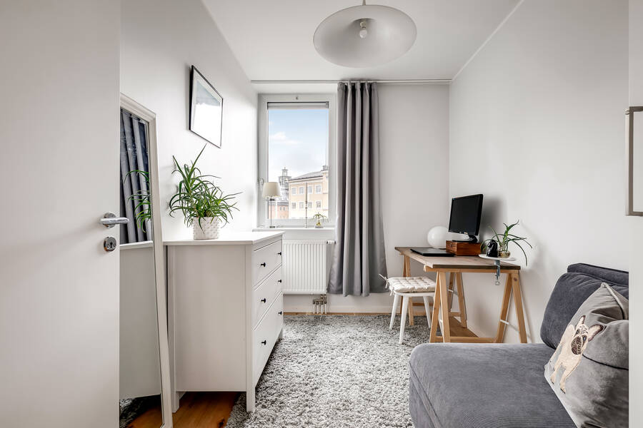 Flexibelt och ljust rum som kan användas som gästrum, kontor eller barnrum. Fönstret skapar en öppen och trivsam känsla med fint ljusinsläpp. Här finns plats för säng och skrivbord eller annan inredning efter behov. Ett mångsidigt rum som anpassar sig efter dina önskemål.