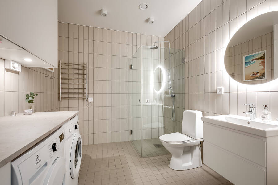 Badrummet är stilrent och rymligt, komplett med en egen tvättdel som ger extra bekvämlighet i vardagen. Genomgående enstavsparkett förstärker bostadens eleganta och tidlösa känsla.