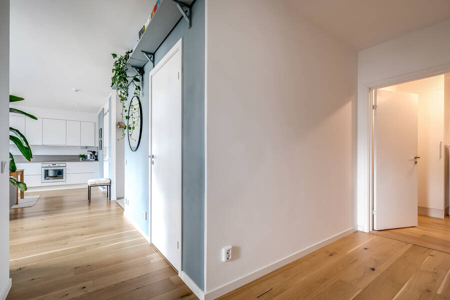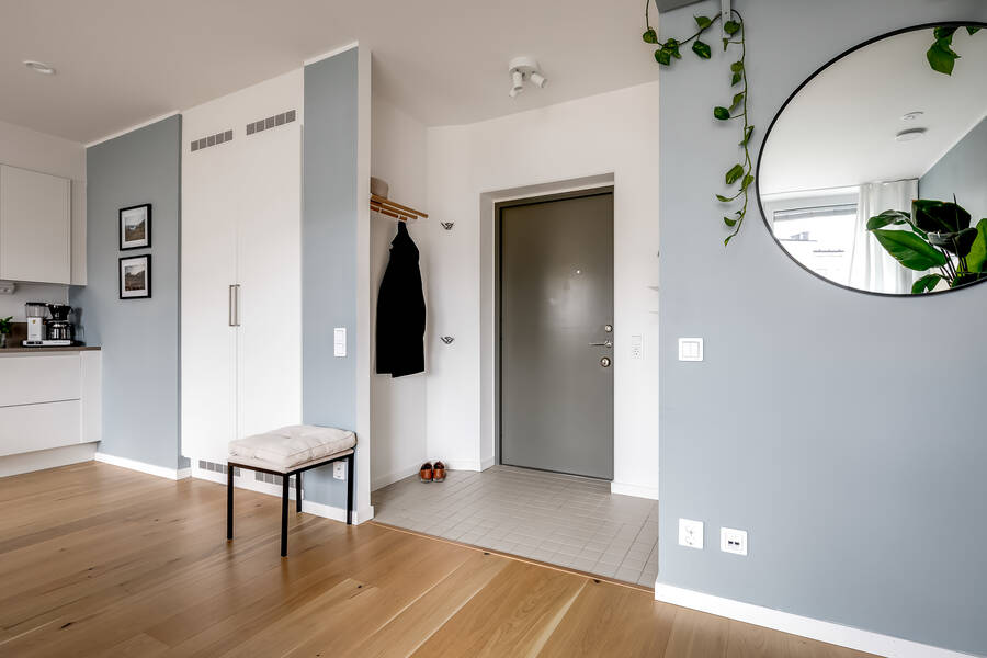 Välkomnande och praktisk hall med gott om plats för avhängning. Här finns en rymlig klädkammare i anslutning, perfekt för extra förvaring. Det ljusa golvet i enstavsparkett löper vidare in i bostaden och skapar en enhetlig känsla. Genom hallen får du en direkt blick mot vardagsrummet och den vackra utsikten över Motala Ström.