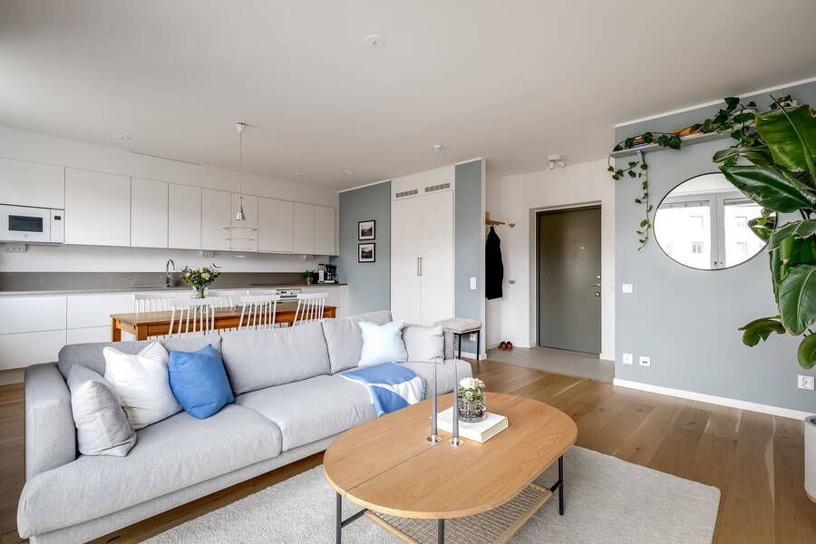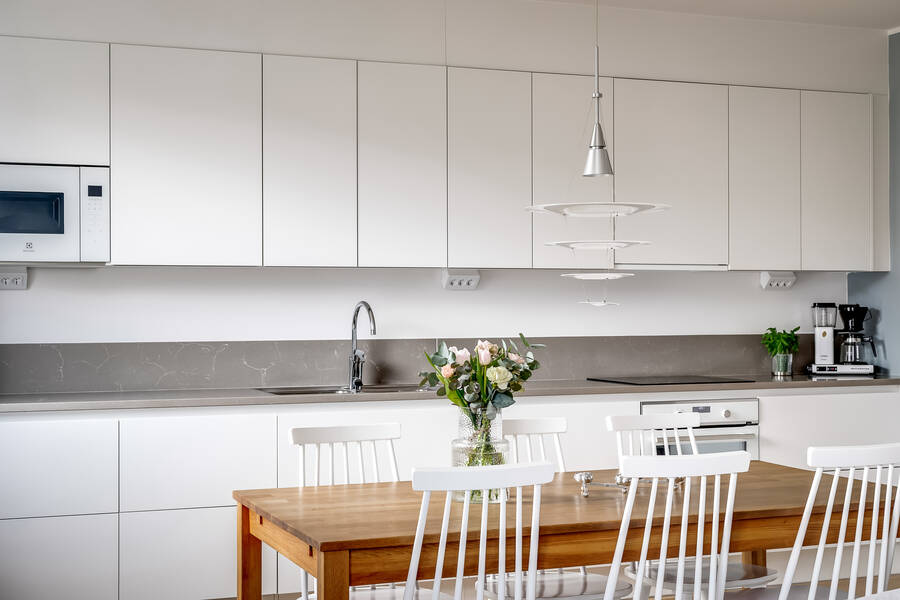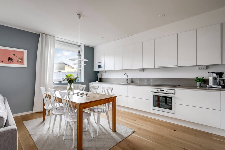 Bostaden präglas av en ljus och luftig atmosfär, där vardagsrummets stora fönster låter utsikten bli en naturlig del av inredningen. Köket imponerar med släta, moderna luckor i vitt utförande och en bänkskiva i en gråspräcklig ton som tillför både karaktär och elegans. Den integrerade kyl- och fryslösningen bidrar till ett stilrent och harmoniskt intryck.