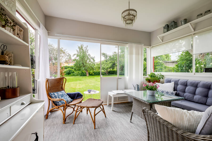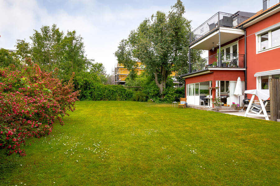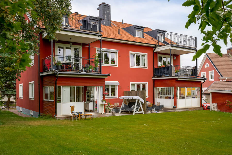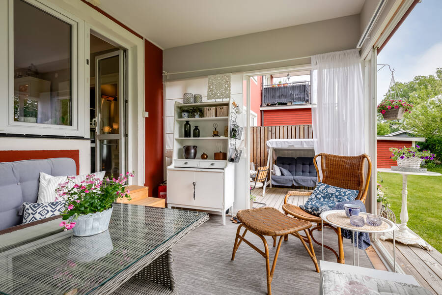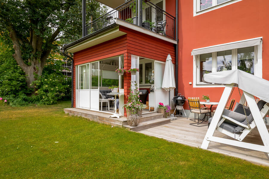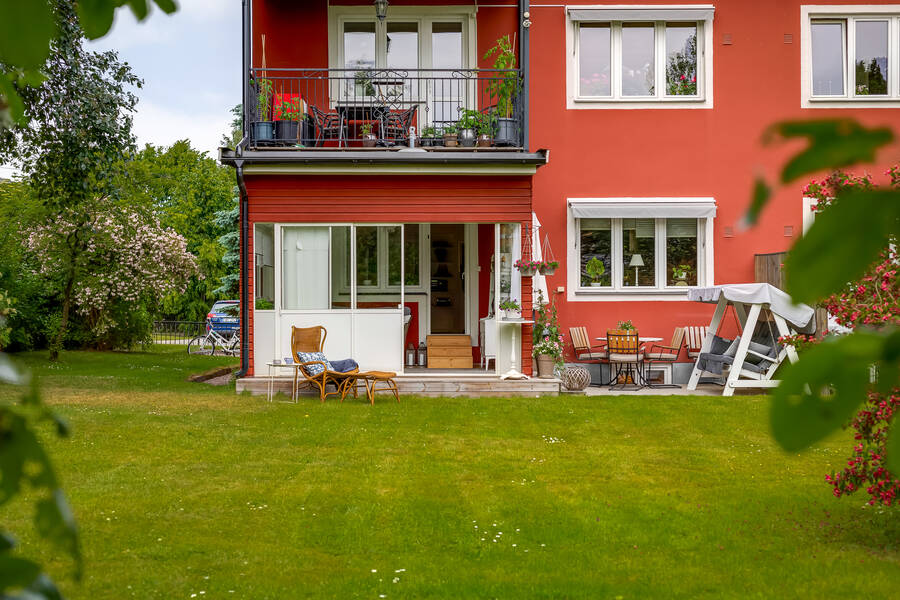 Här bor du en trappa upp från gatan, men med fötterna kvar i gräset. Via den inglasade altanen kliver du ut till din alldeles egna uteplats och till den lummiga gemensamma trädgården med gräsmatta och grillplats. Du får sommarkvällar vid grillen, kaffe i solen och gräsmatta under tårna men utan att behöva känna stress över ett hus som behöver underhållas.