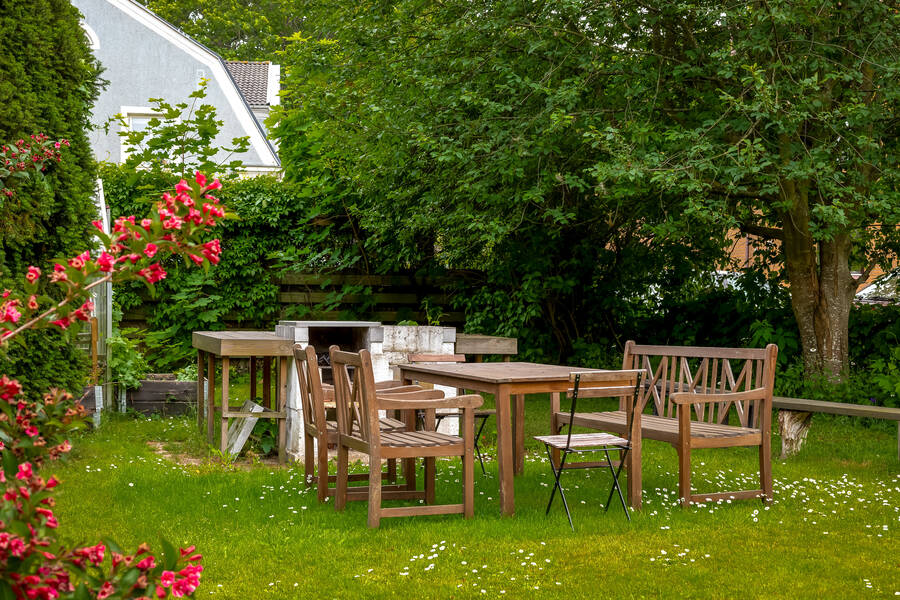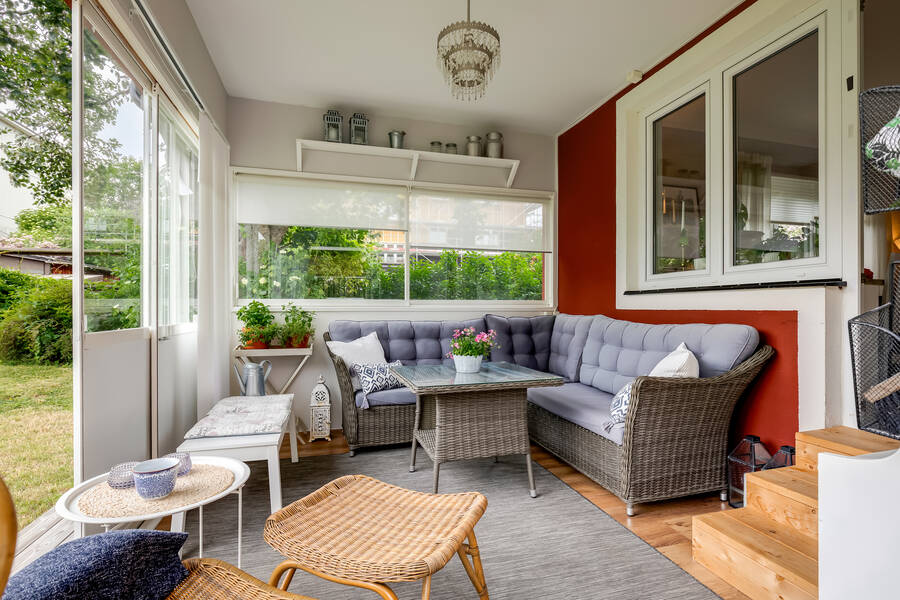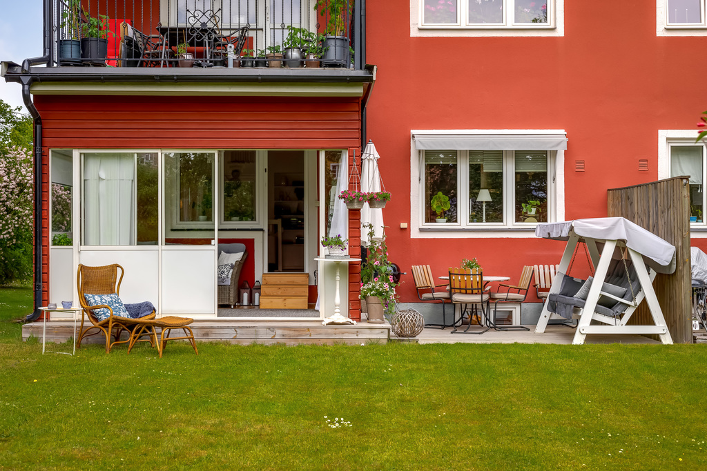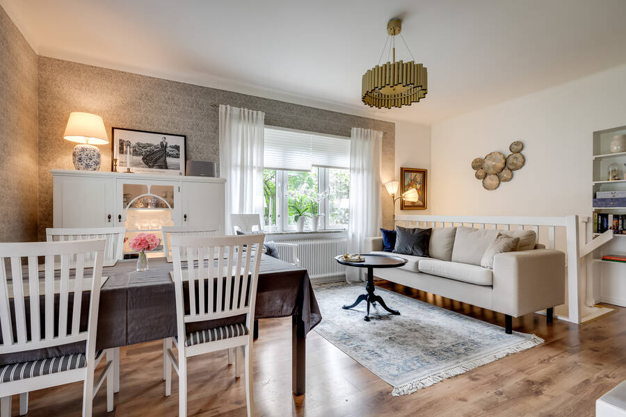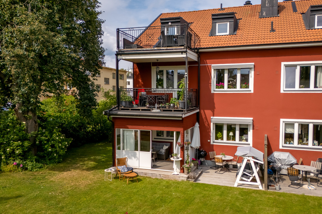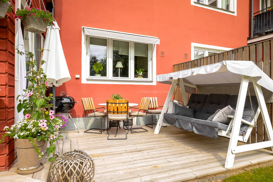 Här bor du en trappa upp från gatan, men med fötterna kvar i gräset. Via den inglasade altanen kliver du ut till din alldeles egna uteplats och till den lummiga gemensamma trädgården med gräsmatta och grillplats. Du får sommarkvällar vid grillen, kaffe i solen och gräsmatta under tårna men utan att behöva känna stress över ett hus som behöver underhållas.