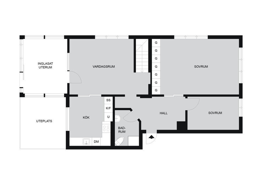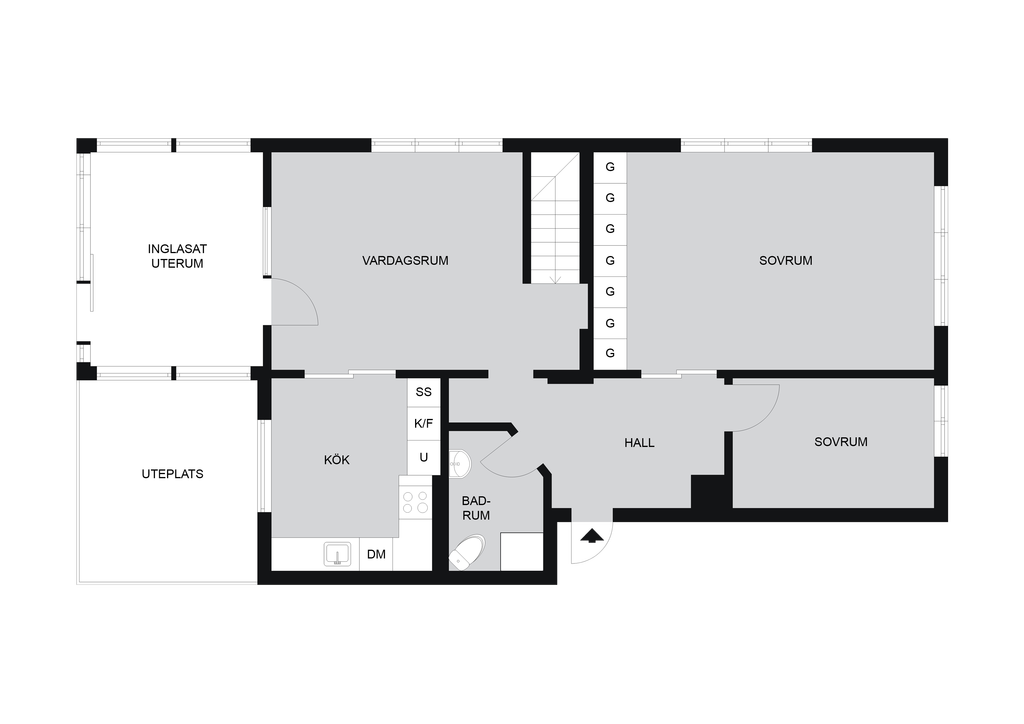 Skjutdörrarna går att öppna upp åt två håll, både mot trädgård och mot uteplatsen. Här finns plats för hörnsoffa eller flera loungemöbler och högst upp på väggen sitter en lång hylla som rymmer allt från krukor till ljuslyktor. De breda trappstegen i trä mot köksentrén bjuder in till smidig servering och gör uterummet till en naturlig förlängning av bostaden under årets varmare månader.