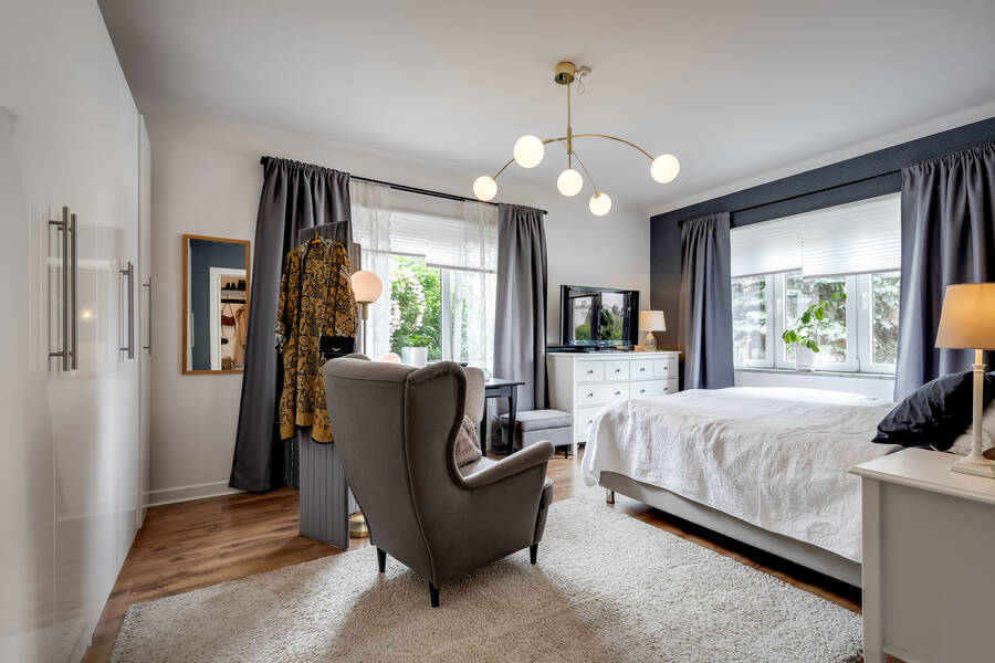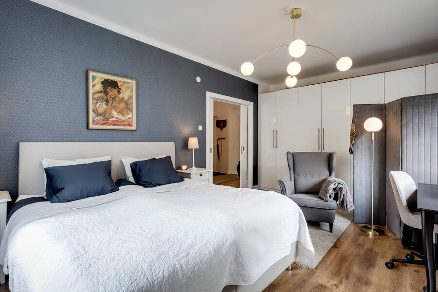 Här ligger samma ljusa laminatgolv som i resten av lägenheten, mot vita väggar och en elegant mörkblå fondvägg bakom sängen som ger djup åt rummet. Det generösa fönsterpartiet släpper in rikligt dagsljus och skapar en luftig känsla. Längs en hel vägg finns en inbyggd garderob med högblanka vita dörrar – gott om plats för kläder, sänglinne och säsongsförvaring. Rummet rymmer utan problem en dubbelsäng med nattduksbord på vardera sida och lämnar yta för en läshörna eller skrivbord vid fönstret. De fria väggytorna inbjuder till extra hyllor eller vägghängda förvaringslösningar vid behov.