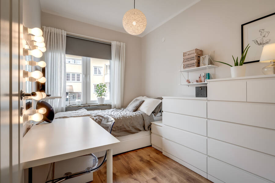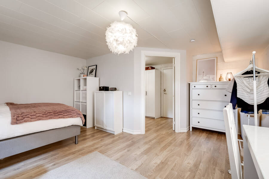 Här ligger samma ljusa laminatgolv som i övriga lägenheten mot väggar i en mjuk, neutral ton som förstärker dagsljuset från det breda fönstret. Rummet rymmer utan problem en säng samt en byrå- eller garderobsvägg längs ena långsidan och lämnar gott om golvyta för skrivbord eller extra förvaring. Höjden bidrar till en ombonad känsla, samtidigt som väggytorna erbjuder plats för vägghyllor eller skåp.