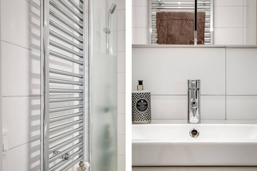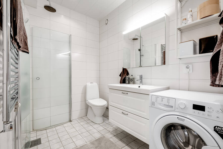 Renoverat 2019 med helkaklade vita väggar och ett ljust, småmönstrat klinkergolv som ger en modern och fräsch känsla. Den rymliga hörnduschen med frostad glasvägg bidrar till ett luftigt intryck, medan infällda spotlights och den upplysta spegeln säkerställer optimalt ljus vid både morgon- och kvällsbestyr. Under det handfatet finns två djupa lådor som rymmer alltifrån handdukar till hygienartiklar. Ovanför tvättmaskin finnes öppna hyllplan för tvättmedel och förvaringslådor. En handdukstork avslutar rummet med både funktion och komfort.