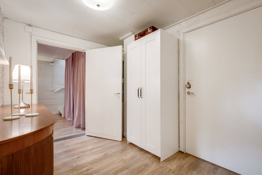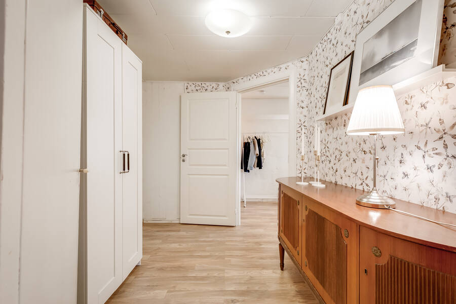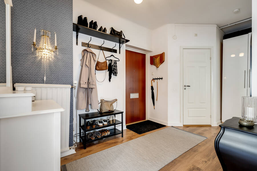 Hallens ljusa laminatgolv och vitmålade väggar skapar en luftig känsla, medan en mönstrad fondtapet ger rummet en subtil karaktär. Här finns utrymme för skoförvaring och en hatthylla för jackor och väskor utan att det känns trångt. Garderob bakom spegeldörrar rymmer gott om kläder eller säsongsförvaring. Från hallen når du duschrum, två sovrum och vardagsrum.