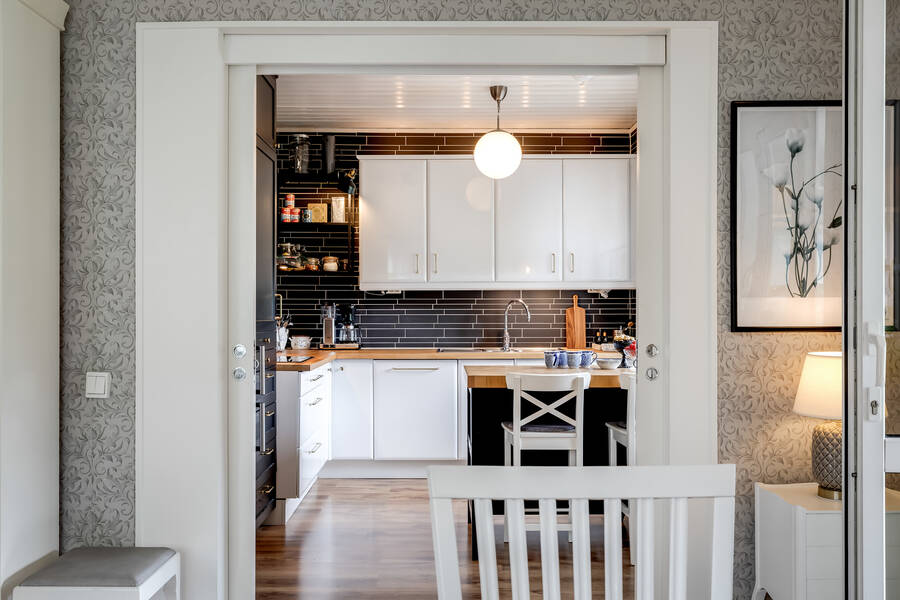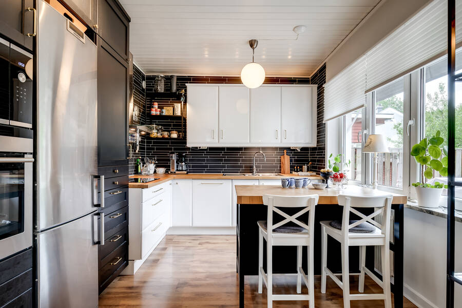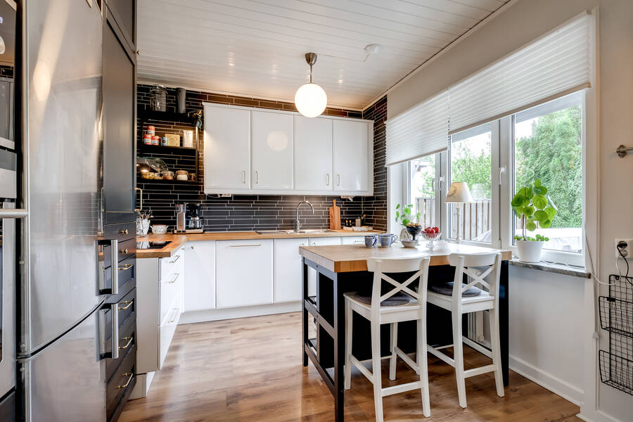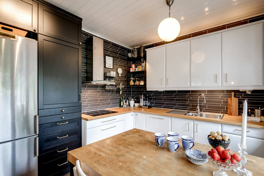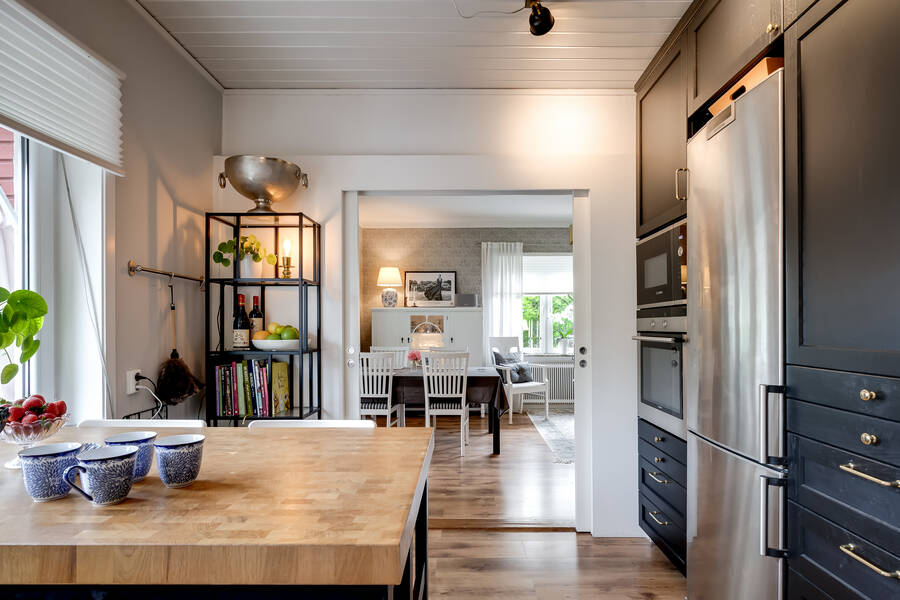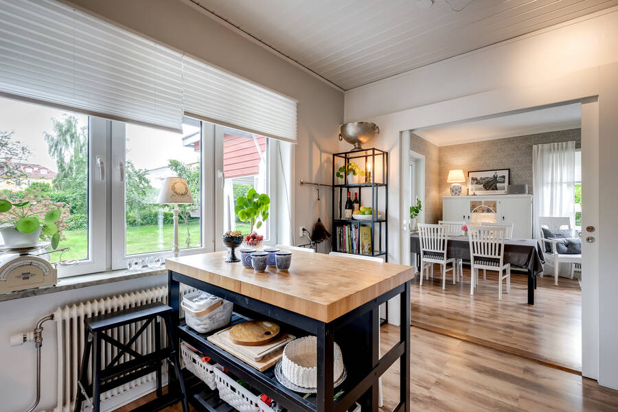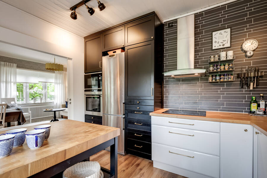 Här möter det laminatgolvet vitmålade väggar. Den mörka kakelväggen bakom arbetsytan ger kontrast och en lättstädad yta. Svarta, höga skåp i kombination med vita underskåp ger gott om dold förvaring för köksmaskiner och porslin, medan öppna svarta hyllplan vid arbetsytan erbjuder plats för kryddor och dekoration. Bänkskivor i massivt trä sträcker sig längs L-format kök och köksön erbjuder både sittplats och extra bänkyta, perfekt för snabba måltider eller socialt umgänge. Stora fönster släpper in rikligt dagsljus och öppningen mot vardagsrummet underlättar både servering och samtal. Markis för att hålla köket svalt även under de soligaste dagarna.