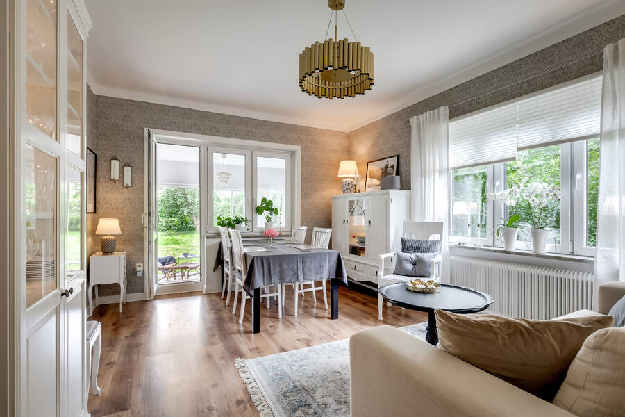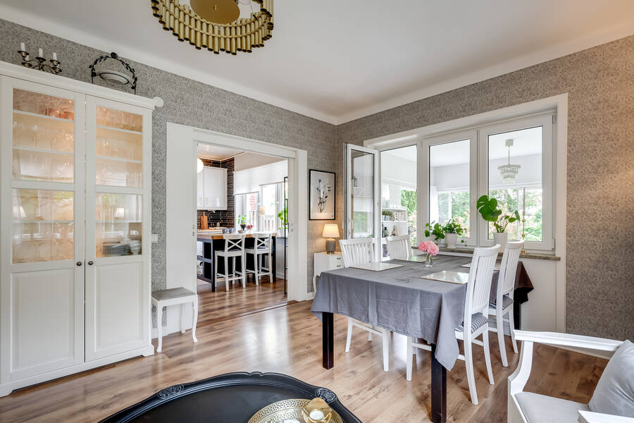 Rummet pryds av samma varma laminatgolv som i hall och sovrum, med vita väggar och en diskret gråmönstrad tapet som skapar en mjuk kontrast. Den öppna planlösningen mot köket underlättar social samvaro, medan dubbla fönsterpartier och utgång till uterum fyller rummet med rikligt dagsljus. Matplatsen rymmer enkelt ett bord för sex personer utan att kompromissa med yta för en sittgrupp eller extra möbler. De fria väggytorna inbjuder till ytterligare vägghyllor eller konst, om så önskas.