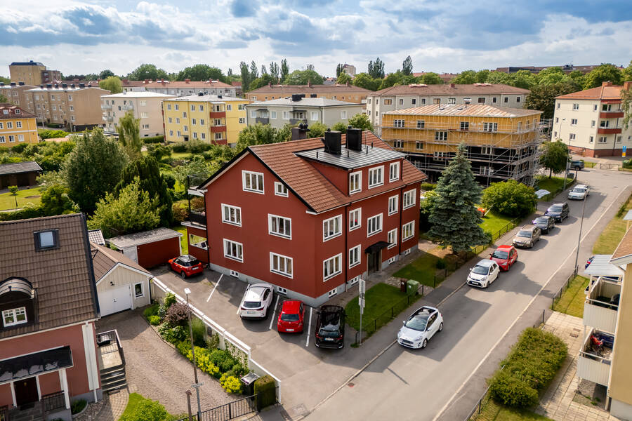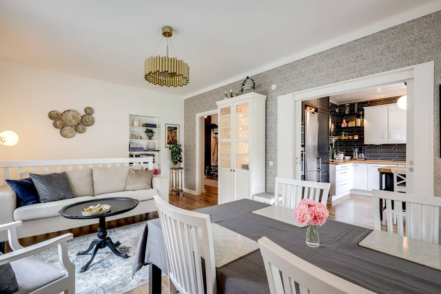 Övriga ytskikt och inredning håller fortsatt hög standard, med bland annat tapetserade väggar från 2019. Köket är trivsamt och funktionellt med gott om arbetsyta, fina materialval och en öppen planlösning mot matplatsen. De stora fönstren ger ett härligt ljusinsläpp och utsikt mot den gröna, gemensamma gräsmattan som inbjuder till lek, umgänge eller bara en stund i solen. Lägenheten har ett lugnt och insynsskyddat läge, men ändå med närhet till service och kommunikationer. Den stora fördelen är den egna parkeringsplatsen precis vid entrén – bekvämt och lättillgängligt varje dag.