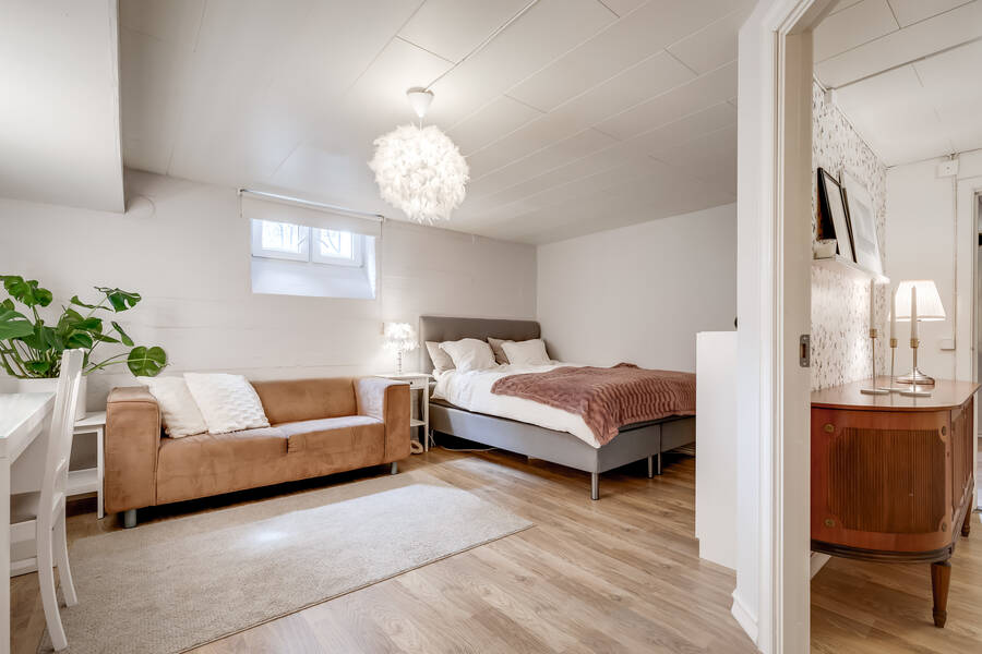 Här bor du med gott om utrymme för hela familjen, med upp till tre sovrum och två vardagsrum – ett på varje våningsplan. Badrummet är smakfullt renoverat 2019 i helkaklat, ljust utförande som ger ett fräscht och modernt intryck.